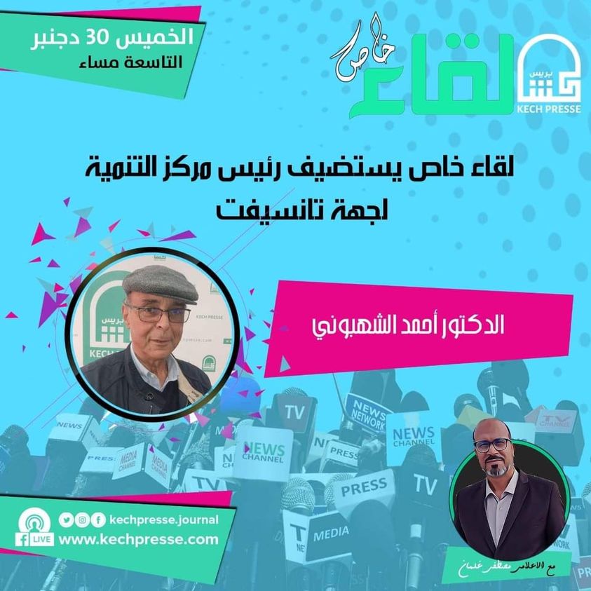 يلتقي جمهور “كش بريس” يومه الخميس 30 دجنبر 2021 الساعة التاسعة مساء، مع مقابلة إعلامية ضمن برنامج “لقاء خاص”، مع رئيس مركز التنمية تانسيفت الأستاذ أحمد الشهبوني.