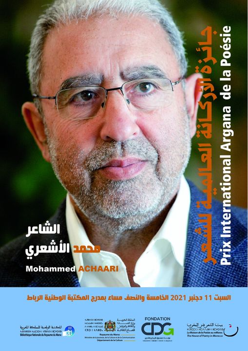يتسلم الشاعر المغربي محمد الأشعري، في حفل رسمي، يقام يوم السبت 11 دجنبر 2021 في الساعة الخامسة و النصف مساء بالمكتبة الوطنية بالرباط، جائزة الأركانة العالمية للشعر، التي ينظّمها كل سنة بيتُ الشعر في المغرب، بشراكةٍ مع مؤسسة الرعاية لصندوق الإيداع والتدبير ووزارة الشباب والثقافة والتواصل.