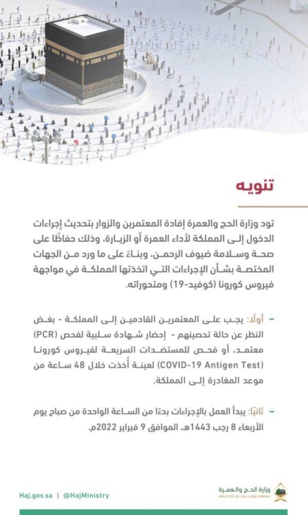 واشترطت السلطات السعودية، على المعتمرين القادمين إلى المملكة – بغض النظر عن حالة تحصينهم – إحضار شهادة سلبية لفحص (PCR) معتمد أو فحص للمستضدات السريعة لفيروس كورونا لعينة أخذت خلال 48 ساعة من موعد المغادرة إلى المملكة.