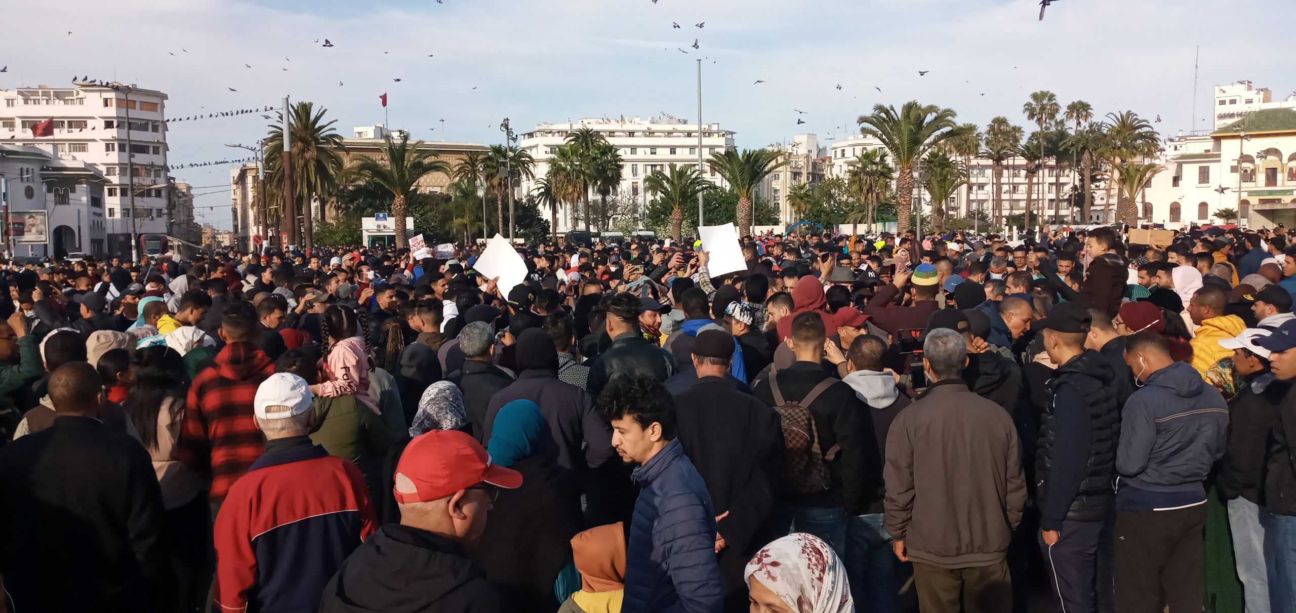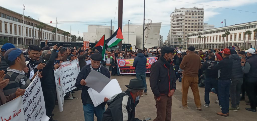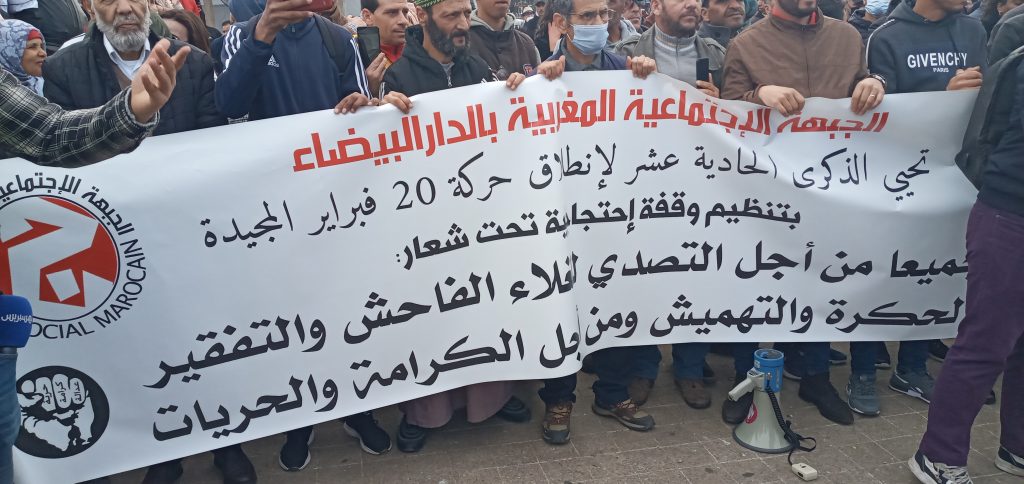 شهدت ساحة لحمام أمام ولاية الدار البيضاء يوم الأحد 20 فبراير الجاري، تظاهرة اجتماعية سلمية دعت لها الجبهة الاجتماعية المغربية، وباقي القوى الديمقراطية والحقوقية ، تمثلت الوقفة الاحتجاجية كذلك ، بالحضور الجماهيري، وامتزجت فيها شعارات ذكرى حركة 20 فبراير حرية – كرامة – عدالة اجتماعية ، وشعارات أخرى تندد وتستنكر غلاء الأسعار مع الحكومة الآنية .كذلك رفعت لافتات تعبر عن التهميش والتفقير، مع إطلاق سراح المعتقلين السياسيين، واجتمعت التصريحات التي التقطها موقع (كش بريس)، بين ما هو سياسي واجتماعي وحقوقي ، والتي عبرت عنها اللافتات والشعارات في انسجام تام.