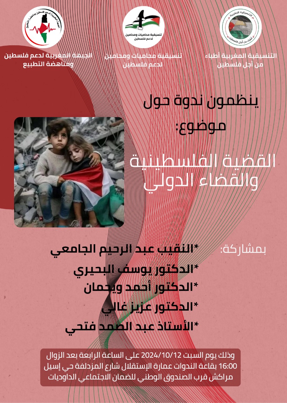 (كش بريس/ التحرير) ـ تنظم التنسيقية المغربية أطباء من أجل فلسطين، وتنسيقة محاميات ومحامين لدعم فلسطين، والجبهة المغربية لدعم فلسطين ومناهضة التطبيع، ندوة حول موضوع :”القضية الفلسطينية والقضاء الدولي”، بمشاركة النقيب عبد الرحيم الجامعي، والدكتور يوسف البحيري عميد كلية الحقوق بمراكش سابقا، والدكتور أحمد ويحمان، والدكتور عزيز غالي، والأستاذ عبد الصمد فتحي، وذلك يوم السبت 12 أكتوبر الجاري في الساعة الرابعة 16.00 بعد الزوال، بقاعة الندوات عمارة الاستقلال شارع المزدلفة حي ايسيل بمراكش، قرب الصندوق الوطني للضمان الاجتماعي الداوديات، والدعوة عامة.