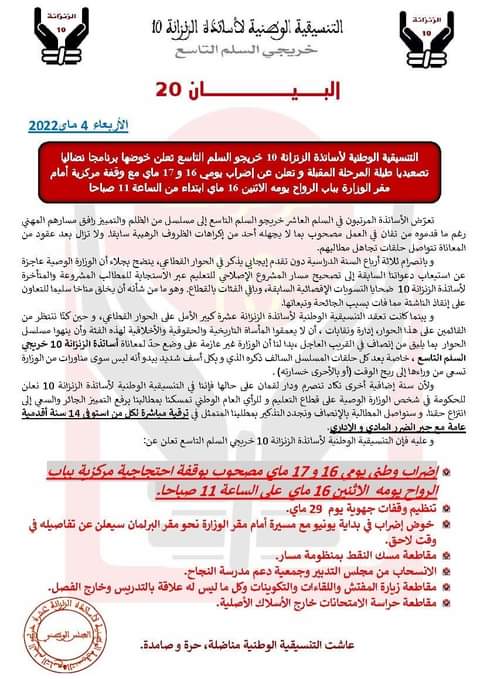 هذا وأعلنت التنسيقية في ذات البيان، توصلت “كش بريس” بنسخة منه، أنه تعلن عن تنفيذ إضراب وطني ل48 ساعة، مصحوبا بوقفة ممركزة أمام مقر وزارة التربية الوطنية في اليوم الثاني من الإضراب، مؤكدة تصعيدها بتنظيم وقفات احتجاجية جهوية يوم 29 ماي الجاري، سيتلوها إضراب وطني ومسيرة احتجاجية أمام مقر البرلمان، شهر يونيو القادم، سيعلن عن تاريخها في وقت لاحق.