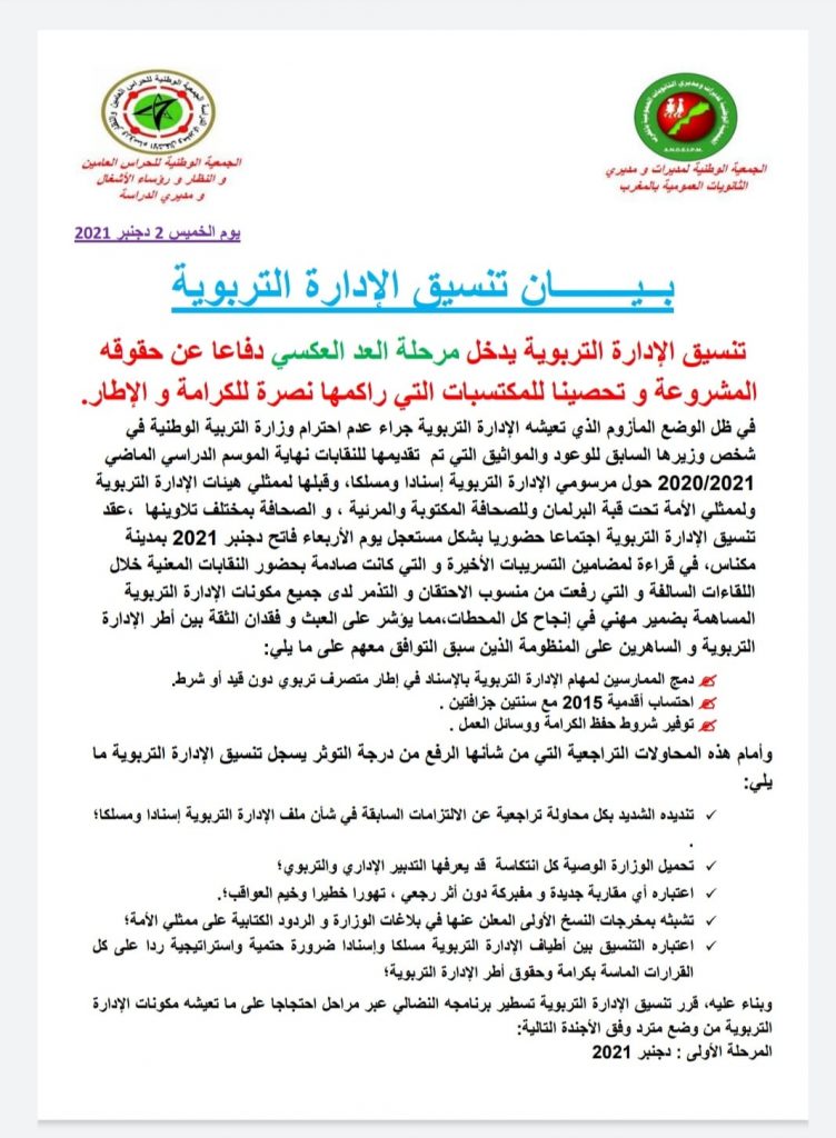 وأكد البيان على تنديد أطر الإدارة التربوية بكل محاولة تراجعية عن الالتزامات السابقة في شأن ملف الإدارة التربوية إسنادا ومسلكا، محملة الوزارة الوصية كل انتكاسة قد يعرفها التدبير الإداري والتربوي. مشددا على أن أي مقاربة جديدة ومفبركة دون أثر رجعي، تعد تهورا خطيرا وخيم العواقب، مؤكدا تشبثه بمخرجات النسخ الأولى المعلن عنها في بلاغات الوزارة والردود الكتابية على ممثلي الأمة.