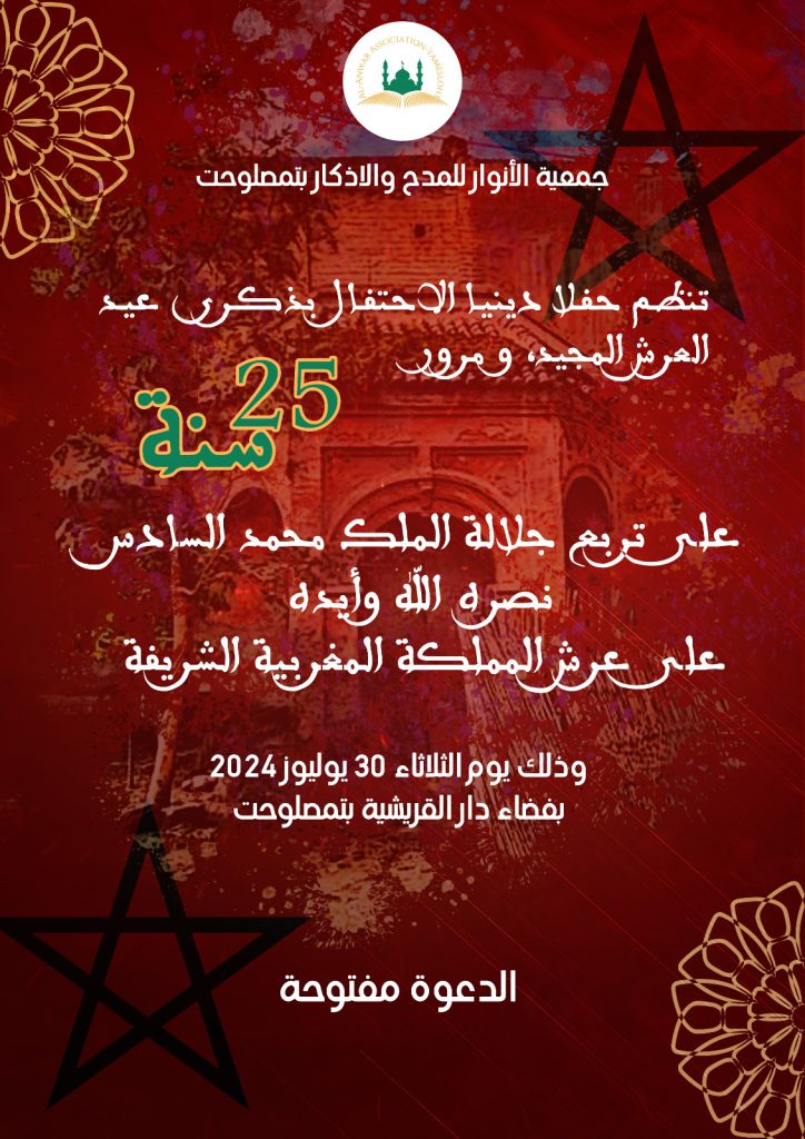 (كش بريس/خاص) ـ احتفاءا بذكرى عيد العرش المجيد، ومرور 25 سنة على تربع جلالة الملك محمد السادس على عرش المملكة المغربية الشريفة، تعتزم جمعية الأنوار للمدح والأذكار بتمصلوحت، والطائفة الأمغارية بتمصلوحت، تنظيم حفل ديني خاص، وذلك تعبيرا عن الفخر والاعتزاز بالإنجازات البارزة التي حققتها المملكة تحت القيادة الحكيمة لجلالة الملك محمد السادس نصره الله وأيده.