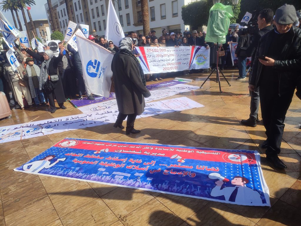 وصدحت حناجر المحتجين الذين كانوا مساندين بعشرات الأساتذة من نقابات أخرى وكذا التنسيقية الوطنية للأساتذة المتعاقدين، بشعارات تنديدية تكرس رفضهم لاستمرار التوقيف المؤقت عن العمل وتوقيف أجور الأساتذة وأطر الدعم، كما الأمر بالنسبة لاستمرار التضييق على ممارسة الحق في الاحتجاج والإضراب.