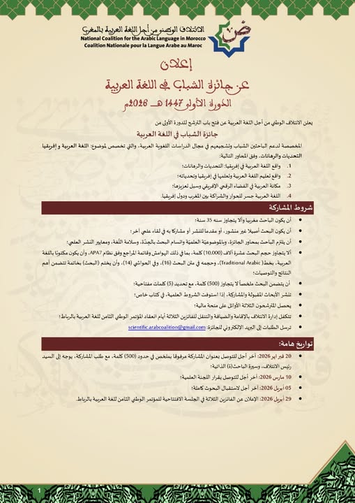 في رحاب العاصمة الرباط، وفي لحظة تاريخية تعكس جدلية اللغة والهوية في المغرب، اجتمعت التنسيقية الوطنية للائتلاف الوطني من أجل اللغة العربية لتعلن عن ولادة مشروع فريد، مشروع يجمع بين الحلم والإبداع، بين البحث والمعرفة، تحت عنوان «جائزة الشباب في اللغة العربية»، الدورة الأولى 1447 هـ – 2026م.