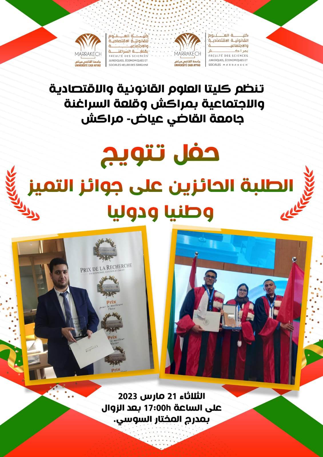 (كش بريس/خاص) ـ تنظم كليتا العلوم القانونية والاقتصادية والاجتماعية بمراكش وقلعة السراغنة جامعة القاضي عياض مراكش، حفل تتويج الطلبة الحائزين على جوائز التميز وطنيا ودوليا، وذلك يومه الثلاثاء 21 مارس الجاري على الساعة الخامسة 17.00 بعد الزوال بمدرج المختار السوسي بكلية الحقوق مراكش.