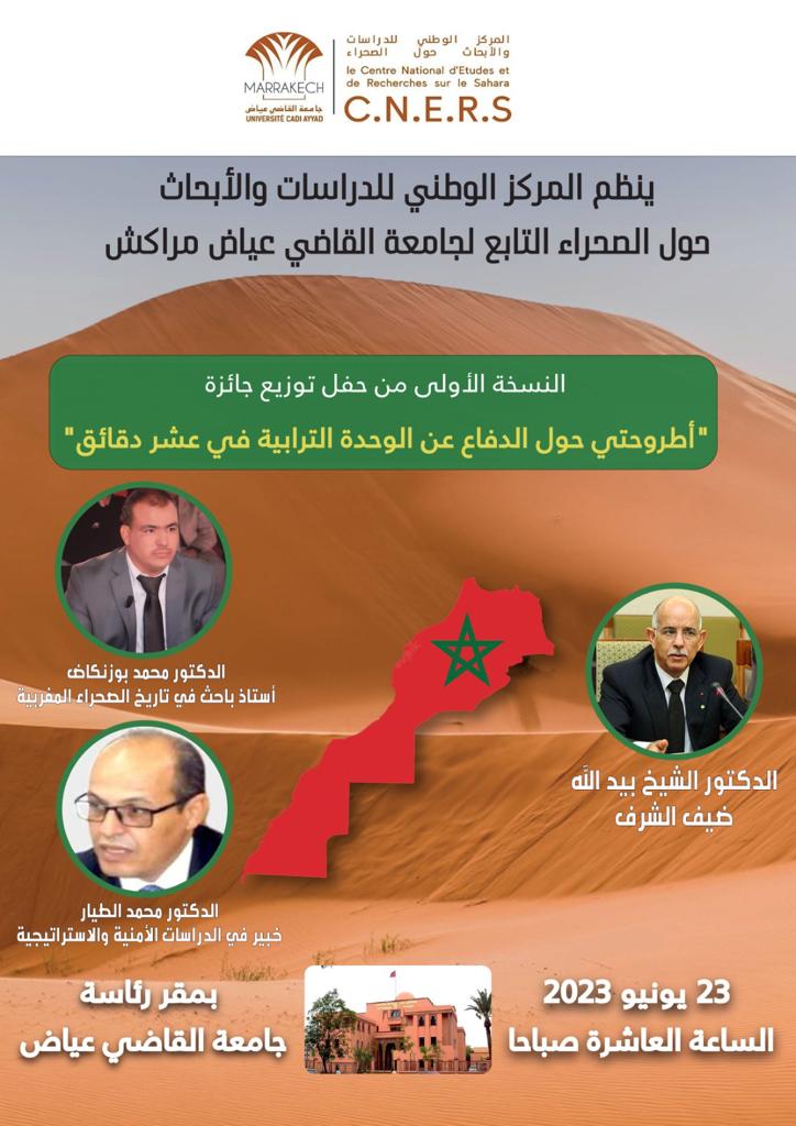 في إطار أنشطته العلمية والأكاديمية التي خطتها أجندة المركز الوطني للدراسات والأبحاث حول الصحراء التابع لجامعة القاضي عياض بمراكش، وبمناسبة تنظيم النسخة الأولى من حفل توزيع جائزة “أطروحتي حول الدفاع عن الوحدة الترابية في عشر دقائق”، تلتئم بفضاء مقر رئاسة جامعة القاضي عياض يوم الجمعة 23 يونيو الجاري في تمام الساعة العاشرة صباحا، لقاء أكاديمي علمي بمشاركة كل من الدكتور الشيخ بيد الله ضيف شرف، والدكتور محمد بوزنكاض أستاذ باحث في تاريخ الصحراء المغربية، والدكتور محمد الطيار خبير في الدراسات الأمنية والاستراتيجيةز