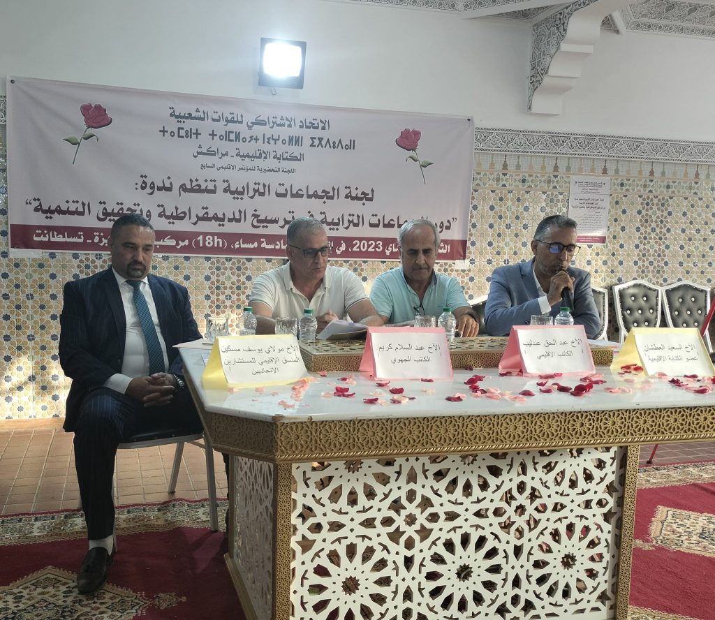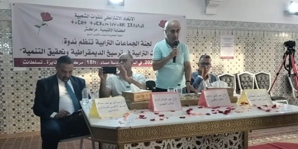 هذا وقام بتأطر الندوة التي حملت عنوان: ” دور الجماعات الترابية في ترسيخ الديمقراطية وتحقيق التنمية” ثلة من الأساتذة الأكاديميين والمنتخبين والأطر الحزبية”، حيث استهلت الندوة بتلاوة آيات بينات من الذكر الحكيم ثم ترديد النشيد الوطني ونشيد الاتحاد الاشتراكي للقوات الشعبية.