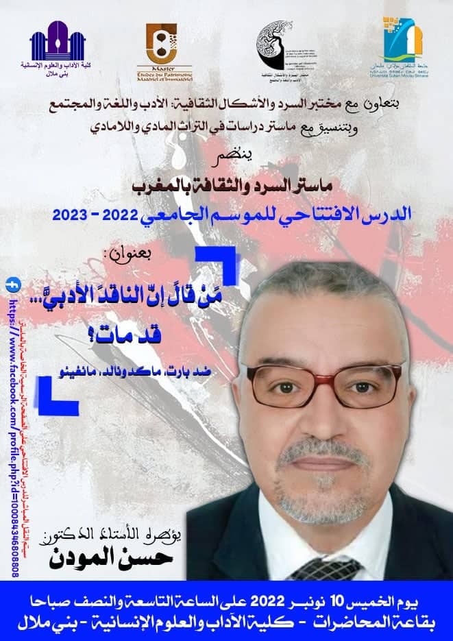 بتعاون مع مختبر السرد والأشكال الثقافية، الأدب واللغة والمجتمع، وبتنسيق مع ماستر دراسات في التراث المادي واللامادي، ينظم ماستر السرد والثقافة بالمغرب، بكلية الآداب والعلوم الإنسانية بني ملال، الدرس الافتتاحي للموسم الجامعي 2023/2022، بتأطير الباحث والناقد الدكتور حسن المودن، في موضوع :”من قال إن الناقد الأدبي .. قد مات؟”، وذلك يوم الخميس 10 نونبر 2022 على الساعة التاسعة والنصف صباحا بقاعة المحاضرات بالكلية بني ملال.