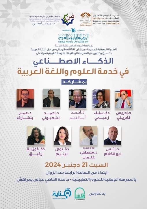 بمناسبة اليوم العالمي للغة العربية، الذي يصادف ال18 من دجنبر من كل عام، تنظم تنسيقية الائتلاف الوطني من أجل اللغة العربية بجهة مراكش آسفي، بتعاون مع المدرسة الوطنية للعلوم التطبيقية جامعة القاضي عياض مراكش، ومؤسسة كش بريس الإعلامية ومركز عناية، ندوة علمية كبرى، في موضوع ” الذكاء الاصطناعي في خدمة العلوم واللغة العربية” بمشاركة الأساتذة: ادريس لكريني وأنس أبو الكلام وسناء زعيمي وأحمد أبادرين وأحمد الشهبوني ونوال اليتيم وعمر بنشارف وتنسيق وتقديم فوزية رفيق ومصطفى غلمان، وذلك يوم السبت المقبل 21 دجنبر 2024 في الساعة الرابعة 16.00 مساء، بمقر المدرسة الوطنية للعلوم التطبيقية .