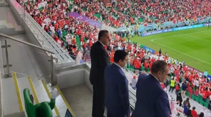 شوهد المدير العام للمديرية العامة للأمن الوطني عبد اللطيف حموشي ورئيس الإدارة العامة للدراسات والمستندات أي المخابرات العسكرية ياسين المنصوري ووزير الخارجية ناصر بوريطة، في مقصورة الضيوف الخاصين بمدرج الملعب لتشجيع المنتخب الوطني لكرة القدم، في المباراة التي جمعته بنظيره الكندي.