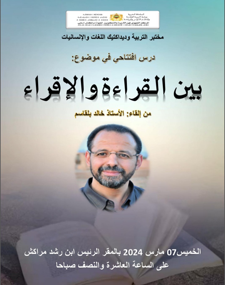 (كش بريس/ خاص) ـ ينظم مختبر التربية، ديداكتيك اللغات والانسانيات بالمركز الجهوي لمهن التربية والتكوين مراكش – ﺁسفي درساً افتتاحياً يلقيه الباحث المغربي الدكتور خالد بلقاسم بعنوان : “بين القراءة والإقراء”، وذلك يوم الخميس 7 مارس 2024 على الساعة العاشرة والنصف صباحاً في المقر الرئيس – ابن رشد – مراكش (قاعة الاجتماعات).