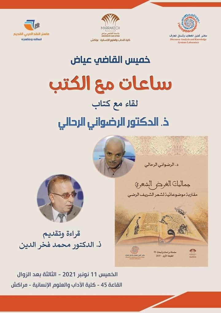 في إطار أنشطة “خميس القاضي عياض” ساعات مع الكتب ـ تنظم كلية الاداب والعلوم الإنسانية بمراكش، بتنسيق بين مختبر تحليل الخطاب وأنساق المعارف، وماستر النقد العربي القديم، أنساقه ومناهجه، لقاء مع كتاب (جماليات الغرض الشعري ـ مقاربة موضوعاتية لشعر الشريف الرضي)، لصاحبه الأستاذ الرضواني الرحالي، قراءة وتقديم الأستاذ محمد فخر الدين، وذلك يوم الخميس 11 نونبر الجاري الساعة الثالثة بعد الزوال، بالقاعة 45 بذات الكلية المنظمة.