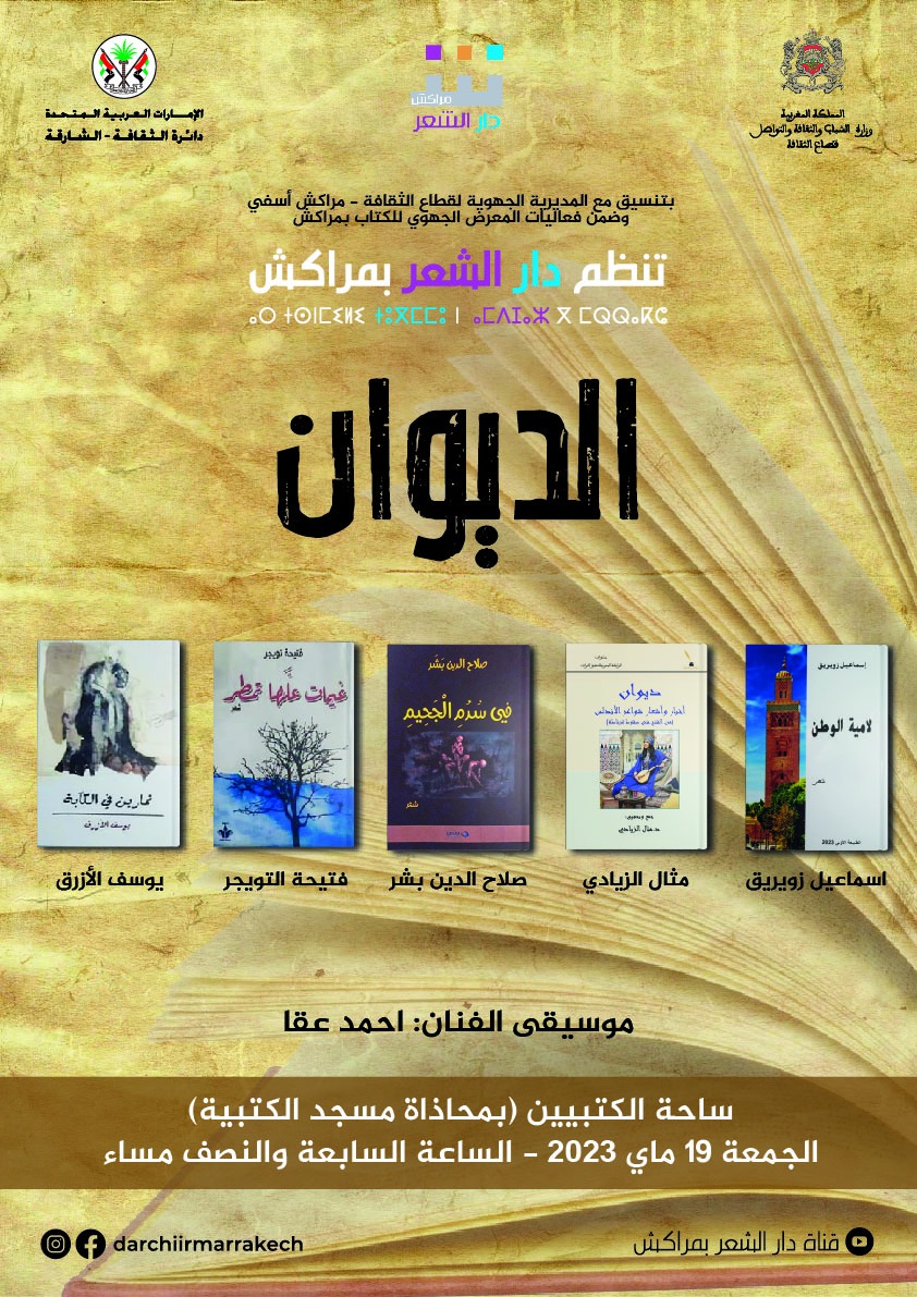 ضمن فعاليات الدورة 13 للمعرض الجهوي للكتاب بمراكش، تحتفي دار الشعر بمراكش، بتنسيق مع المديرية الجهوية لقطاع الثقافة مراكش آسفي، بإصدارات شعرية ونقدية في فقرة “الديوان”بفضاء ساحة الكتبيين ( المعرض بمحاذاة مسجد الكتبية) – الجمعة 19 ماي 2023 – على الساعة السابعة والنصف مساء.