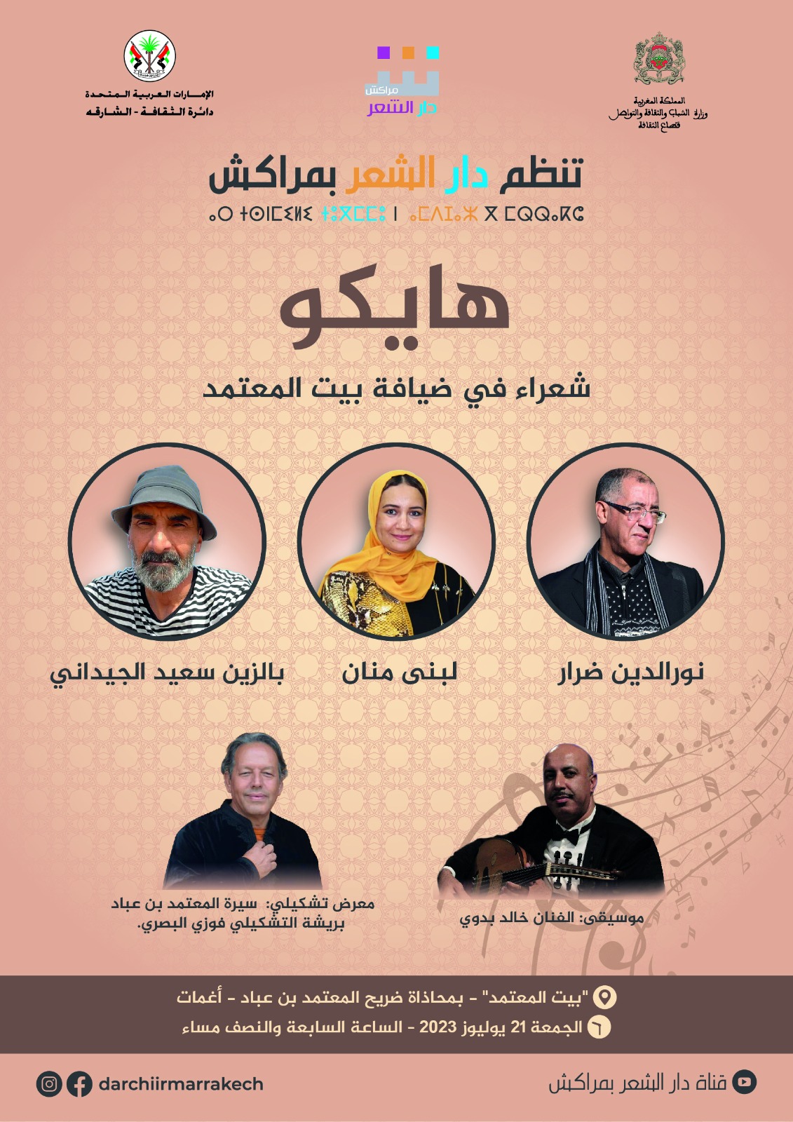 أما فقرة “هايكو” لدار الشعر بمراكش، فتشكل أول لقاء شعري وثقافي ضمن هذا المسار الجديد، وهي لحظة تستعيد من خلالها الدار هذا الإرث الأندلسي للشاعر المعتمد بن عباد (1040-1095م). الشعراء نورالدين ضرار ولبنى منان وبالزين سعيد الجيداني، في ديوان شذري يستدعي مفارقات الزمن وانجراحات الشاعر أمام مصيره خصوصا وهم يتأملون عتبة الشاهد، بعض مما طلب المعتمد كتابته على قبره: “ولا تزال صلوات الله دائمة/ على دفينك لا تحصى بتعدادِ..”