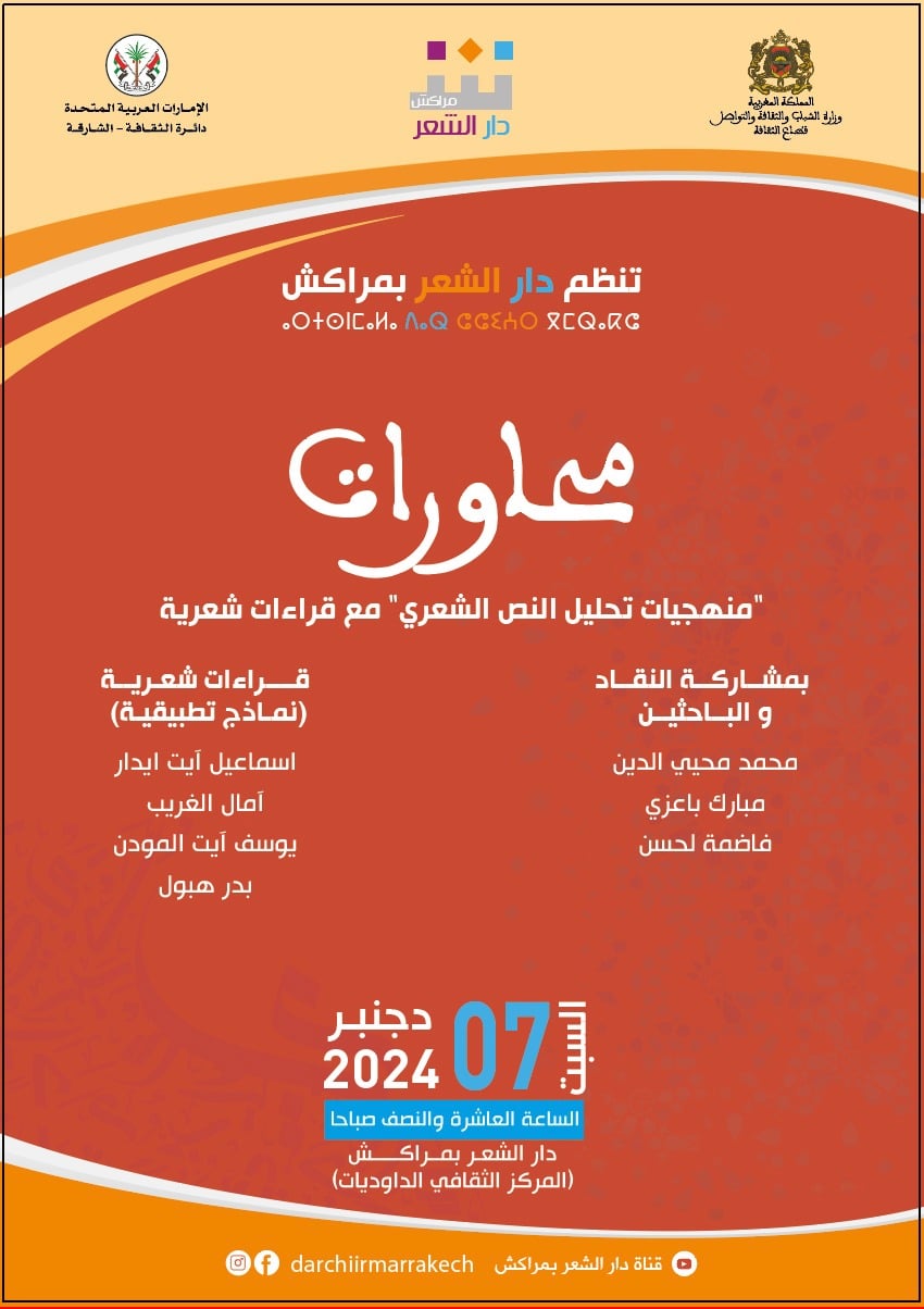 تنظم دار الشعر بمراكش، يوم السبت 7 دجنبر بمقر الدار (الكائن بالمركز الثقافي الداوديات) على الساعة العاشرة والنصف صباحا، فقرة جديدة من برنامج “محاورات”.. ويشارك في هذا اللقاء ثلة من النقاد والباحثين والشعراء، والذين سبق لهم التتويج بجائزة النقاد والباحثين الشباب، والتي تنظمها دار الشعر بمراكش سنويا، الناقد محمد محيي الدين والناقدة فاضمة لحسن والناقد مبارك أباعزي، فيما يشارك في فقرة قراءات شعرية، ضمن النماذج التطبيقية، كل من الشعراء: إسماعيل آيت إيدار، آمال الغريب، يوسف آيت المودن، بدر هبول.