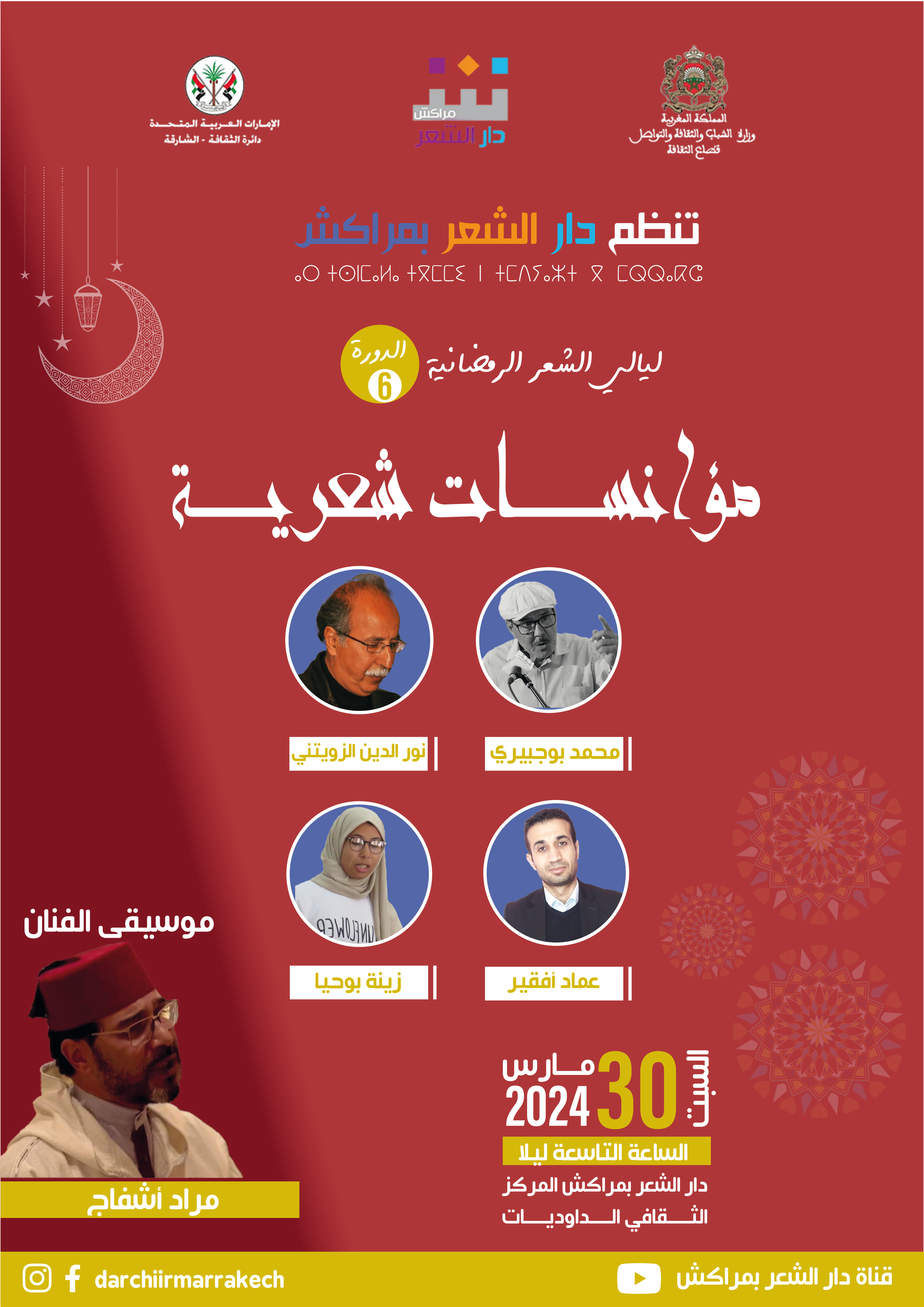 في حوار الشعر والموسيقى، يلتقي الشعراء والفنان المنشد مراد أشفاج، للاحتفاء بلحظة ثقافية ومعرفية، تواصل من خلالها دار الشعر بمراكش الاحتفاء بأصوات شجرة الشعر المغربي الوارفة، الموسومة دوما بالإخصاب والجمال بين فضاءات الدار، هذا الفضاء الرمزي الذي جمع الشعراء المغاربة من مختلف الحساسيات والتجارب، والذي يسعى دوما الى تجديد لبرمجته الثقافية وسعي دؤوب لمنظور جديد يراعي تداولية أوسع للشعر بين متلقيه.. أجيال القصيدة المغربية اليوم تلتقي في مؤانسات شعرية، ومعها نقترب من هذا المنجز الشعري والإبداعي المتعدد.
