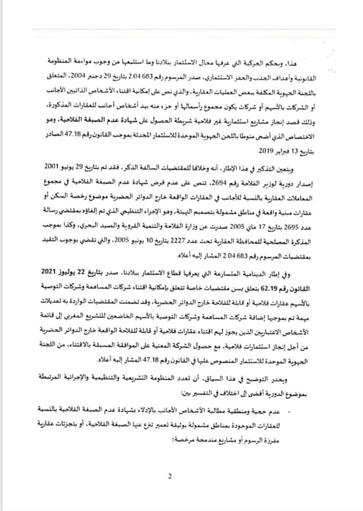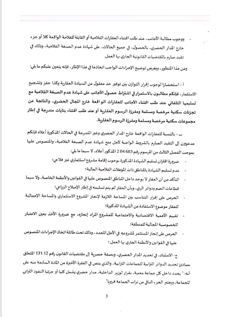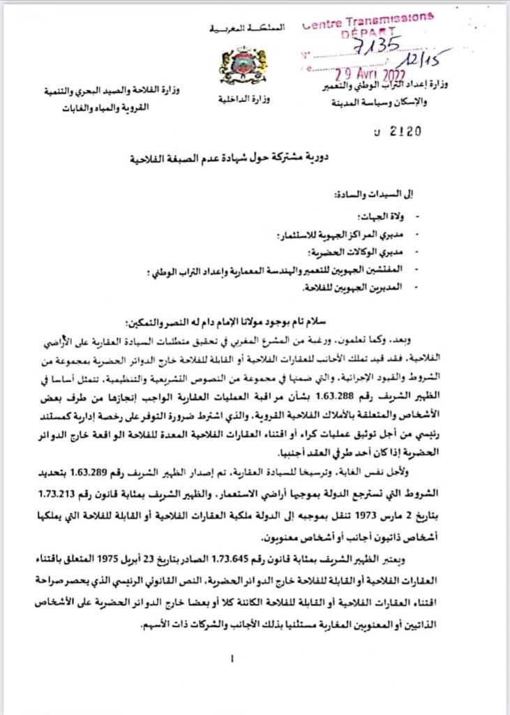 صدرت دورية مشتركة، تحمل توقيع كل من وزارة إعداد التراب الوطني والتعمير والإسكان وسياسة المدينة ووزارة الداخلية ووزارة الفلاحة والصيد البحري والتنمية القروية والمياه والغابات، موجهة لولاة الجهات ومديرية المراكز الجهوية للاستثمار والمفتشين الجهويين للتعمير والهندسة المعمارية وإعداد التراب الوطني، والمديرين الجهويين للفلاحة، بتاريخ 29 ابريل 2022 “حول شهادة عدم الصبغة الفلاحية”، تتعلق بسن مقتضيات حاصة، تتعلق بإمكانية اقتناء شركات المساهمة وشركات التوصية بالأسهم عقارات فلاحية أو قابلة للفلاحة خارج المدار الحضري، والتعديل الجاري بإضافة شركات المساهمة وشركات التوصية بالأسهم الخاضعين للتشريع المغربي، إلى قائمة الأشخاص الاعتباريين، الذين يجوز لهم اقتناء العقارات إياها، من أـجل إنجاز استثمارات فلاحية، مع حصول الشركة المعنية على الموافقة المسبقة بالاقتناء من اللجنة، الجهوية الموحدة للاستثمار.