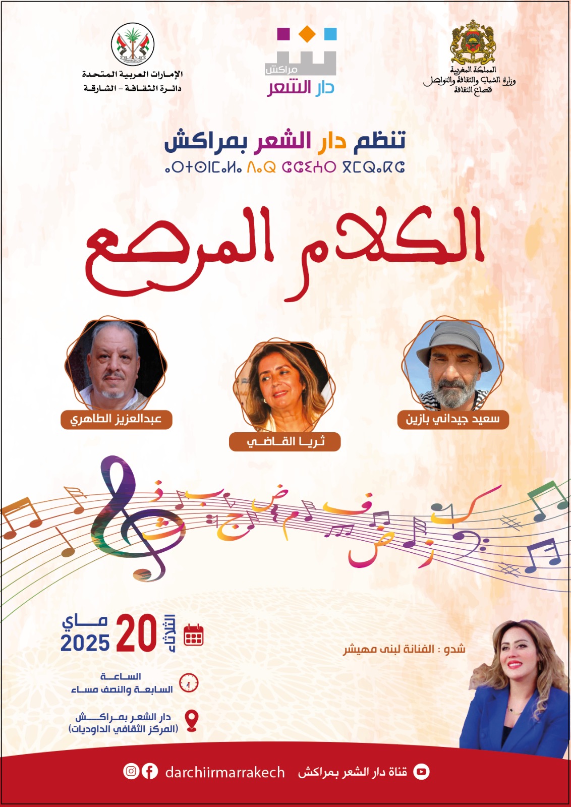 (كش بريس/ التحرير) ـ ديوان زجلي جديد تفتحه دار الشعر بمراكش ضمن برنامجها “الكلام المرصع”، وذلك يوم الثلاثاء 20 ماي بمقر الدار (الكائن بالمركز الثقافي الداوديات) على الساعة السابعة والنصف مساء، وبمشاركة الشعراء: مولاي عبدالعزيز الطاهري وثريا القاضي وسعيد جيداني بازين. فيما تحضر في المصاحبة الموسيقية الفنانة لبنة مهيشر، في إطلالة فنية جديدة على صوت مراكشي يشارك لأول مرة. فقرة “الكلام المرصع”، والتي أطلقتها الدار منذ ثمان سنوات، تشكل نافذة أساسية على المشهد الشعري الزجلي في المغرب، واستضافت فيها أصوات شعرية وأجيال وحساسيات من مختلف التجارب، في ترسيخ لهذا الأفق الإبداعي الخصب للقصيدة الزجلية في المغرب.