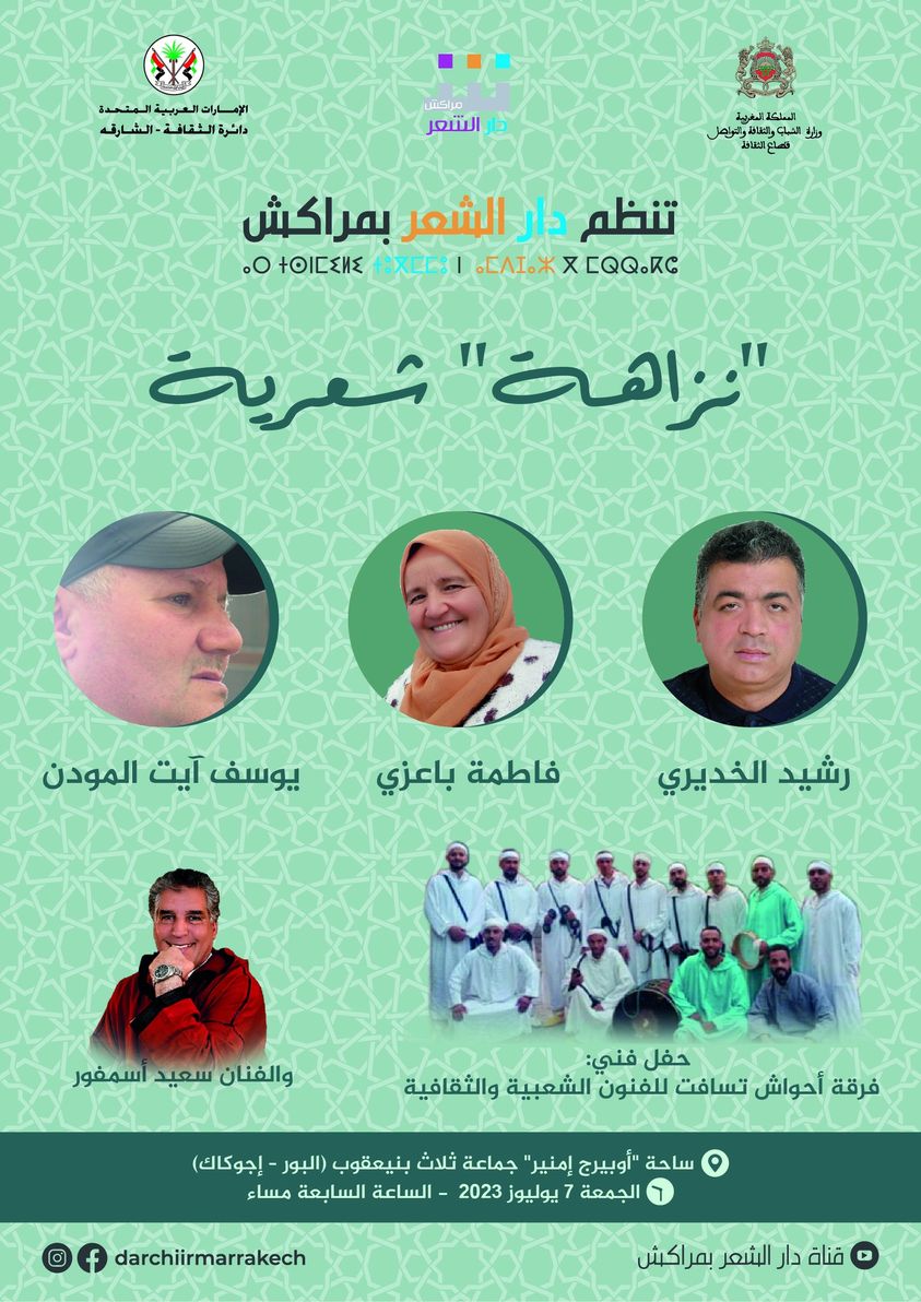 ويشارك الشعراء: رشيد الخديري وفاطمة باعزي ويوسف آيت المودن في ديوان جديد من “نزاهة” شعرية والتي تشهد تنظيم حفل فني تحييه فرقة أحواش تسافت للفنون الشعبية والثقافية، الى جانب المشاركة المتميزة للفنان سعيد أسمفور. فقرة “نزاهة” شعرية، تستدعي أحد التقاليد الاجتماعية الراسخة في مدينة مراكش، هذه اللحظة الاجتماعية والاحتفائية، والتي يتناغم خلالها الشعر بالموسيقى وفن الطبخ واختيار للحدائق والفضاءات المفتوحة، ضمن نسج للحظة فرح جماعي.