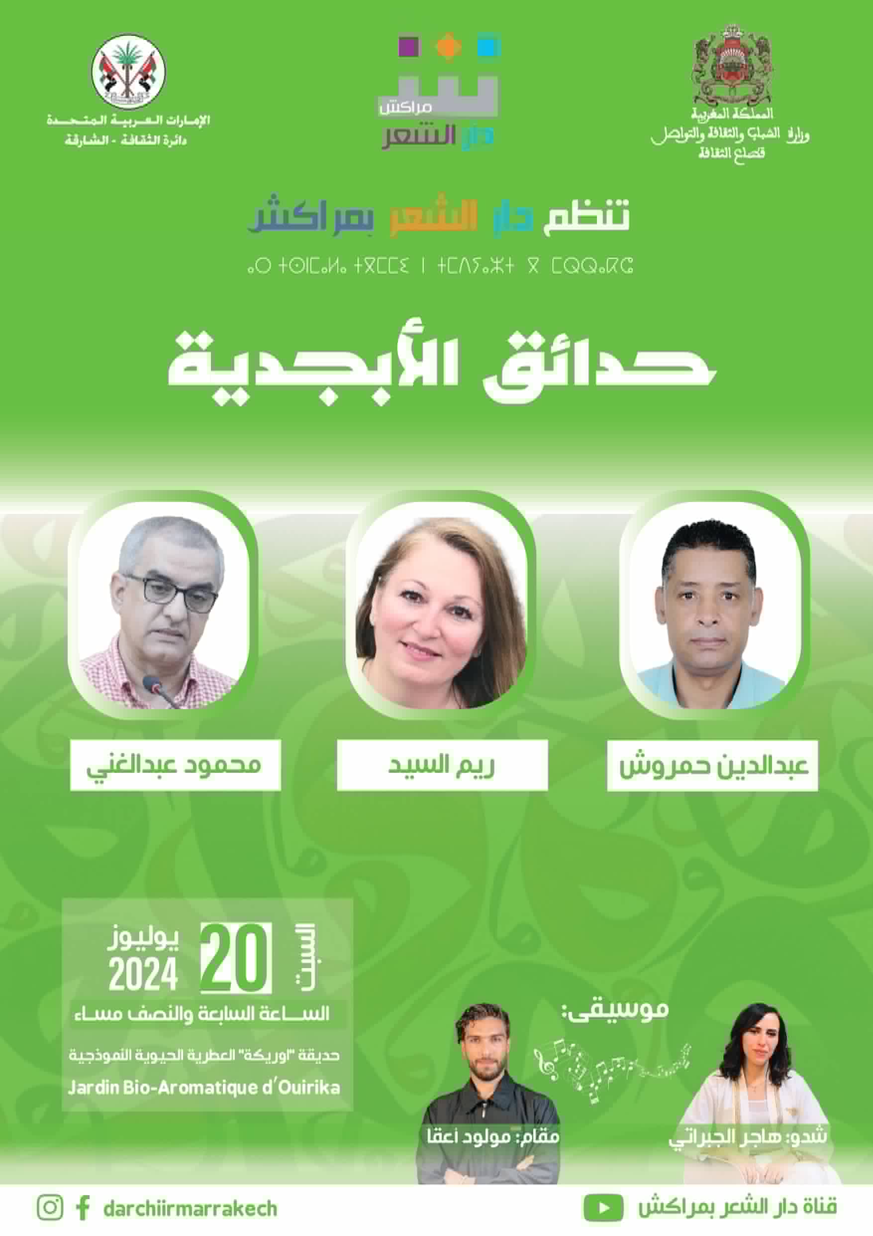 وتحتضن حديقة أوريكا العطرية الحيوية هذه الفعاليات، والتي تعرف مشاركة الشعراء عبدالدين حمروش والشاعرة السورية ريم السيد (مقيمة في فرنسا) ومحمود عبدالغني، في فقرة تعرف مشاركة الفنانة هاجر الجبراتي، فيما يصاحبها الفنان مولود أعقا على آلة القانون. فقرة جديدة من “حدائق الأبجدية” تحتفي بالشعر وبالشعراء، وتواصل من خلالها دار الشعر بمراكش رحلة الترحال ضمن تظاهرة “نزاهة شعرية” في محطة ثالثة، وإصرار دائم على تنويع فضاءات التلاقي والبرمجة والتدبير الثقافي.