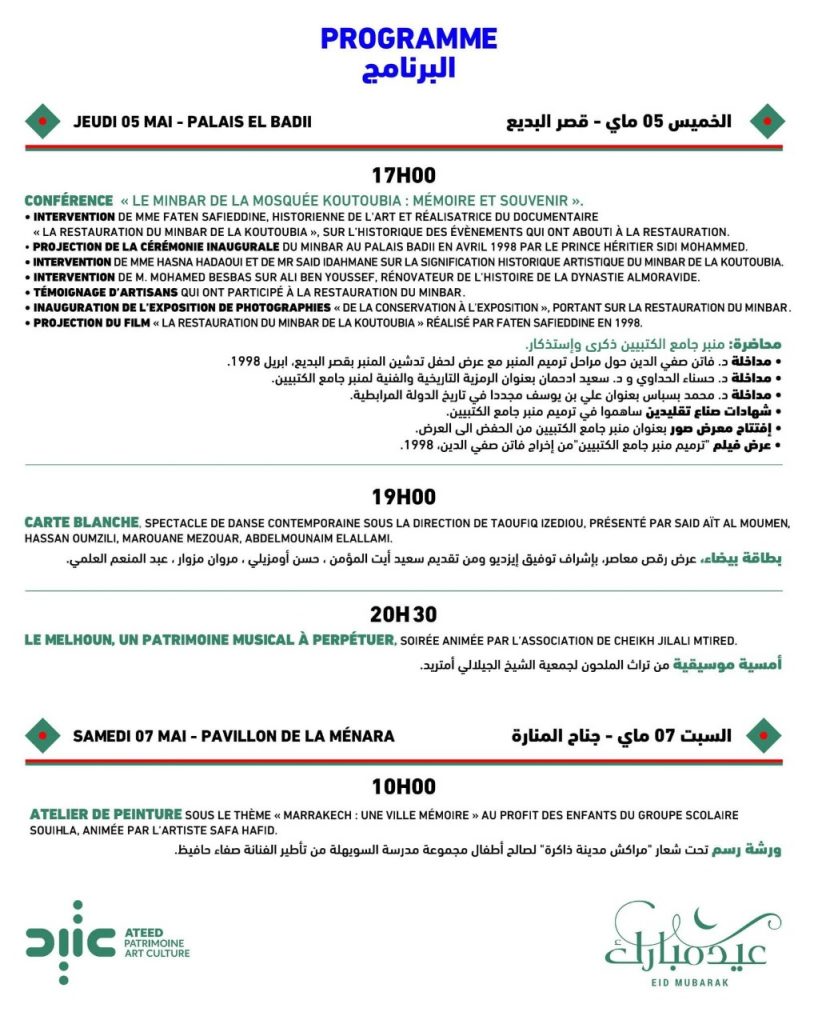 في السياق ذاته وابتداء من الساعة الخامسة مساء سيكون عموم الباحثين والمهتمين على موعد مع ندوة علمية ثانية تحت عنوان: “منبر جامع الكتبيين ذكرى واستذكار” تتخللها مداخلات للأساتذة المتخصصين: فاتن صفي الدين، حسناء الحداوي، محمد بسباس الذين سيتناولون بالبحث والدراسة جوانب من التأصيل التاريخي لمنبر الكتبيين وأهم المراحل التي تخللت عملية ترميمه وخصائصه الفنية والتقنية، بالإضافة إلى شهادات حية لمجموعة من الصناع التقليديين الذين واكبوا وساهمو في عمليات ترميمه، كما سيتم افتتاح معرض صور تاريخية موسوم ب “منبر جامع الكتبيين من الحفض إلى العرض” إلى جانب عرض فيلم وثائقي يوثق لترميم المنبر التاريخي السالف الذكر.