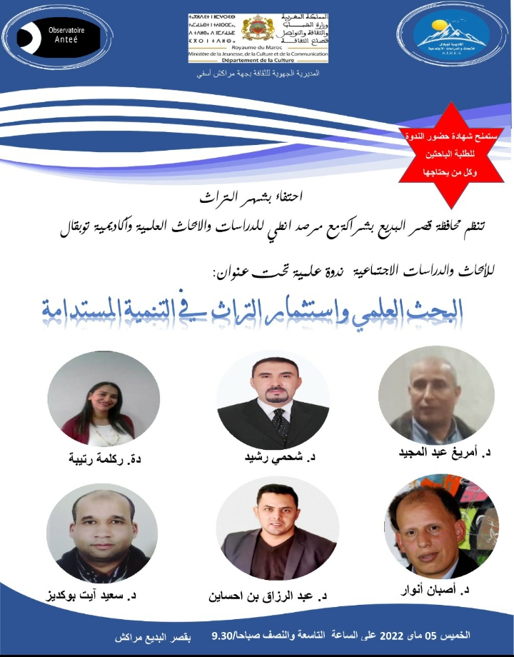 في إطار احتفال المديرية الجهوية للثقافة مراكش أسفي بشهر التراث، تنظم محافظة قصر البديع ومركز أنطي للأبحاث والدراسات العلمية وأكاديمية توبقال للأبحاث والدراسات الإجتماعية فعاليات ندوة علمية حول موضوع: “البحث العلمي واستثمار التراث في التنمية” وذلك بفضاء المعلمة التاريخية قصر البديع ابتداء من الساعة التاسعة والنصف حيث سيقارب الأساتذة: رشيد شحمي، رتيبة ركلمة، عبد الرزاق بن حساين، أنوار أصبان، سعيد أيت بوكديز، عبد المجيد أمريغ تيمات بحثية مرتبطة بالمتاحف والخرائط الطبيعية والتراث الديني وأكدال البراني ورزنامة من الحلول والتوصيات التي تستشرف أفاق التنمية المستدامة بمدينة مراكش.