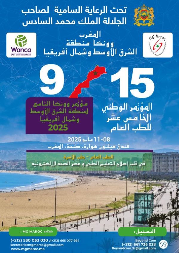 (كش بريس/ خاص) ـ ينظم تجمع الأطباء العامون بالمغرب، برعاية ملكية سامية الدورة الخامسة عشر لمؤتمره الطبي بموازاة مع الدورة التاسعة لمؤتمر المنظمة العالمية لطب الاسرة والطب العام لمنطقة الشرق الأوسط وشمال أفريقيا WONCA وذلك بفندق “هيلتون هوارة” بمدينة طنجة أيام 8 – 9 – 10 – 11 ماي 2025.