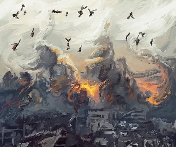 الرسم تحت هو لصورة واقعية التقطتها عدسات الكاميرات (انظر الرابط في أول تعليق)، فما يظهر فيها ليست عصافير، بل أشلاء بشرية تتطاير في سماء رفح بجنوب قطاع غزة جراء قصف عنيف تعرضت له المنطقة وأودى بحياة عشرات الشهداء: https://x.com/…/fattimeh_ali/status/1908233498587988210