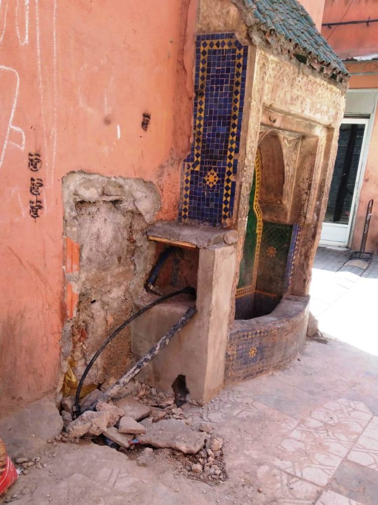 وقد أدرك الجميع أن المراد من هذه العملية ما هي إلا مبادرة بتعليمات من عمدة المدينة قصد در الرماد في العيون ليس إلا، من أجل امتصاص غضب أفراد هذه الأسر المستضعفة، حيث ظل يردد أغلبهم : ” جات يداويه وهي تعميه “، خراب في خراب، ودمار في دمار ساد المكان، صارت تسرق مخلفاته بين الفينة والأخرى المشمئزة لنظر الزائر عدسات كاميرات السياح الأجانب الذين يمرون في طريقهم إلى مطعم سياحي شهير بذات المكان، بعدما اعتادوا خلال زيارات سابقة رؤية جمالية معالم هذه السقاية التاريخية القديمة والناس يتوافدون عليها من أجل ملء جرادلهم وأوعيتهم بالماء الشروب، وقد أصبح حال هذه السقاية على غرار باقي حال وأحوال باقي سقايات المدينة العتيقة بمراكش، خراب ودمار.. إلى درجة أنها أضحت كلها مهددة بالاندثار، وأعضاء الأغلبية المسيرة للمجلس البلدي الحالي برئاسة عمدة مراكش،