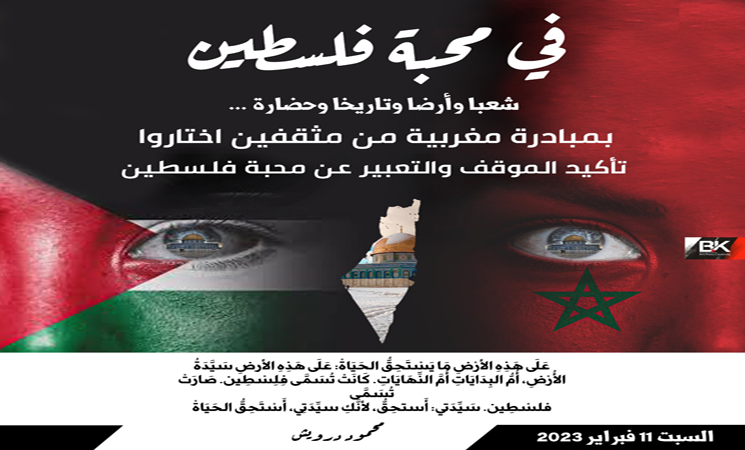أعلن مثقفون مغاربة، عن تنظيم قراءات شعرية تحت شعار “في محبة فلسطين” من إبداعات مغربية وفلسطينية وعربية، بعدد من المدن المغربية، يوم السبت 11 فبراير2023.