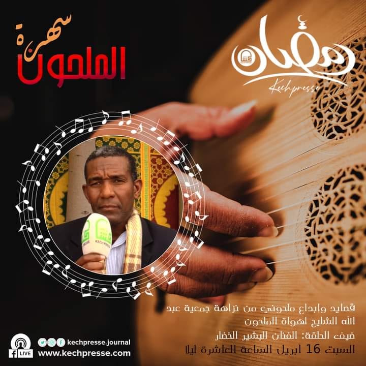 يلتقي جمهور “كش بريس” مساء يومه السبت 16 أبريل 2022 ابتداء من الساعة العاشرة ليلا 22.00 مع برنامج “قصايد وإبداع ملحوني” من نزاهة جمعية عبد الله الشليح لهواة الملحون، ضمن برامج شهر رمضان الفضيل على قناتنا وموقعنا KECHPRESSE.COM.