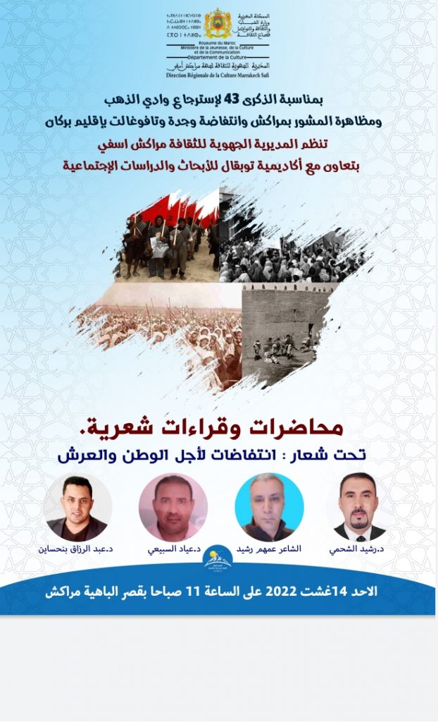 تحت شعار “انتفاضات من أجل الوطن والعرش”، وبتعاون مع أكاديمية توبقال للأبحاث والدراسات الاجتماعية، تنظم المديرية الجهوية للثقافة مراكش- أسفي –قطاع الثقافة- يوما دراسيا وشعريا بمناسبة الذكرى 43 لاسترجاع إقليم وادي الذهب ومظاهرة المشور بمراكش وانتفاضة وجدة وتافوغالت ببركان، وذلك يوم الأحد 14 غشت 22 على الساعة الحادية عشرة صباحا بالمعلمة التاريخية قصر الباهية بمراكش.