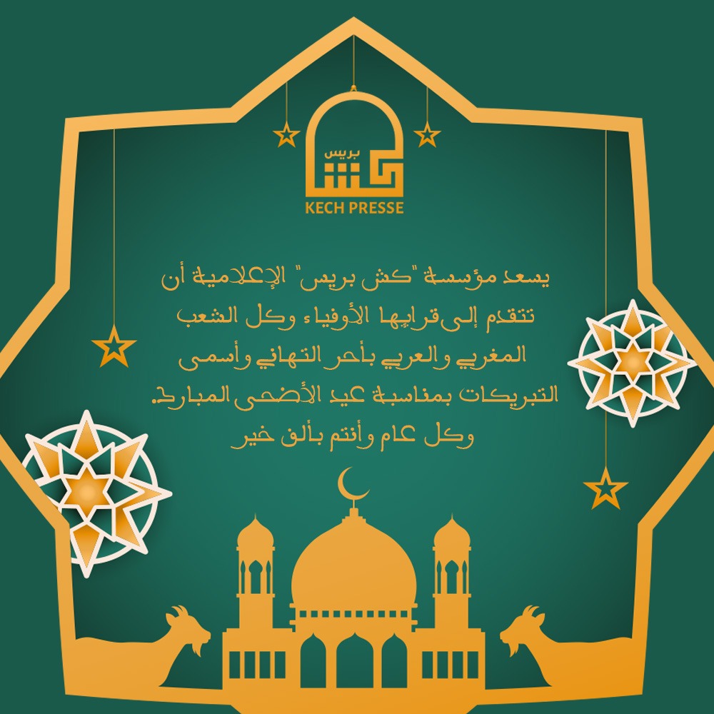بمناسبة عيد الأضحى المبارك، تتقدم الإدارة العامة لمؤسسة “كش بريس” الإعلامية، بأزكى وأصدق عبارات التهاني والتبريكات، لكل الشعب المغربي والوطن العربي والإسلامي قاطبة، وللملك محمد السادس، وأن يعيده علينا وعليكم باليمن والبركات، وأن يتقبل منا ومنكم صالح الأعمال والطاعات، وأن يضاعف لنا الأجر والثواب وينعم علينا بالأمن والسلام والخيرات. عيد سعيد وكل عام وأنتم بخير.