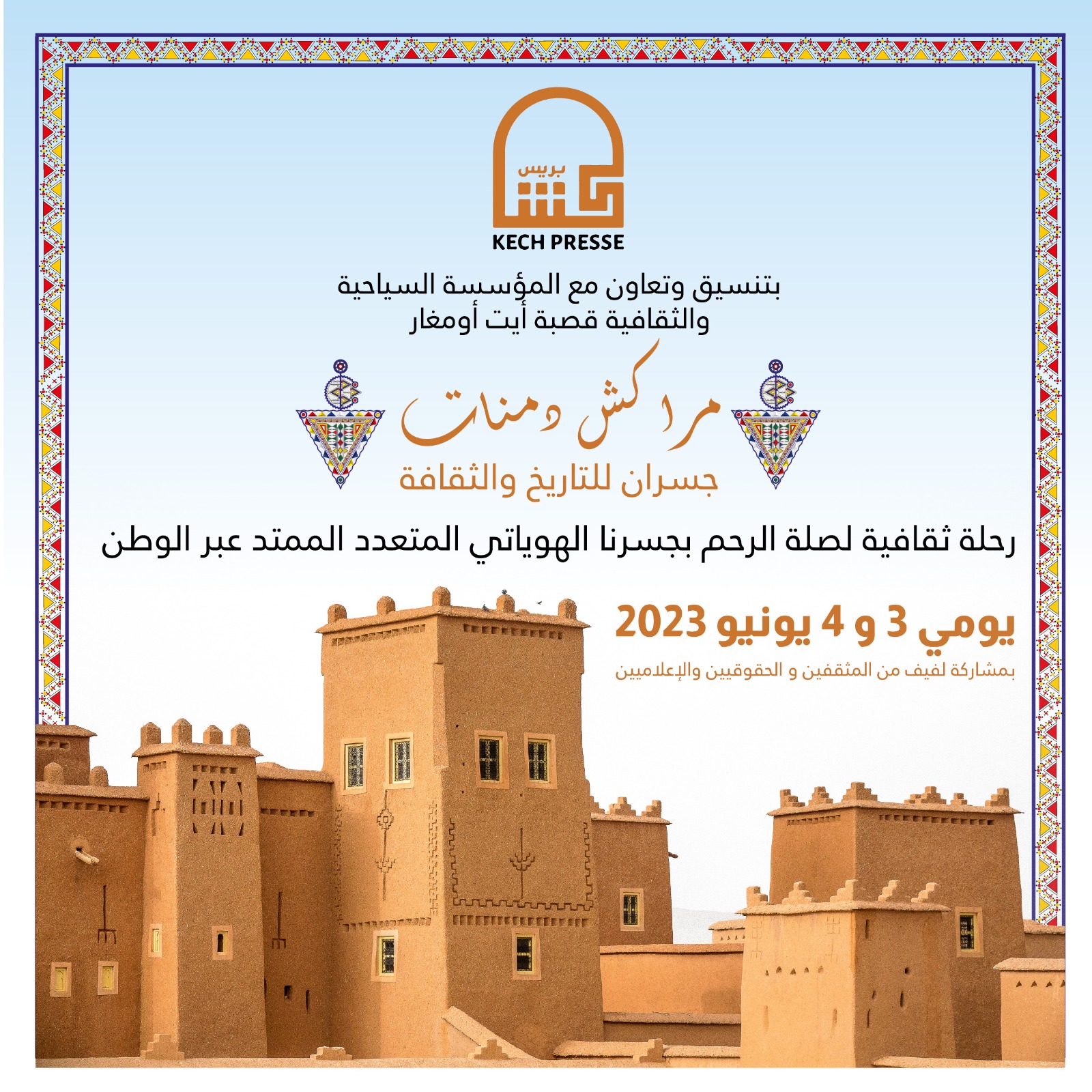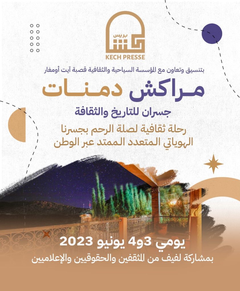 (كش بريس/خاص) ـ انفتاحا على محيط حاضرة مراكش الثقافية والتاريخية، وتفكيرا بمد جسور التواصل بين المؤسسات الثقافية المحلية ودورها في تنمية الإنسان والعمران، تنظم مؤسسة “كش بريس” الإعلامية، بشراكة وتنسيق مع مؤسسة قصبة ايت اومغار السياحية، وبلدية دمنات، وبلدية دمنات، رحلة ثقافية سياحية إلى مدينة دمنات، إحدى أهم المدن الحضرية الواقعة في النفوذ الترابي لجهة بني ملال ازيلال، والتي “سبقت مراكش بأربعين سنة”، كما هو متعارف عليه في أدبيات التاريخ الحديث والمعاصر للمملكة المغربية، حيث تحمل ظهيرا سلطانيا يرفعها إلى مصاف المدن الحضرية المغربية منذ 1887 في عهد المولى الحسن الأول، بالإضافة إلى أن سورها اعتبر برأي المؤرخين تراثا وطنيا بقرار وزيري منذ العام 1942.