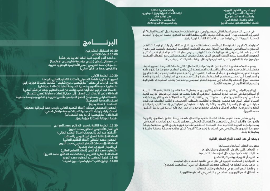 موعد الملتقى الفكري التربوي سيكون يوم الخميس 9 فبراير 2023 ابتداء من الساعة التاسعة والنصف 09.30 صباحا برحاب مدرج الشرقاوي إقبال بكلية اللغة العربية بمراكش.