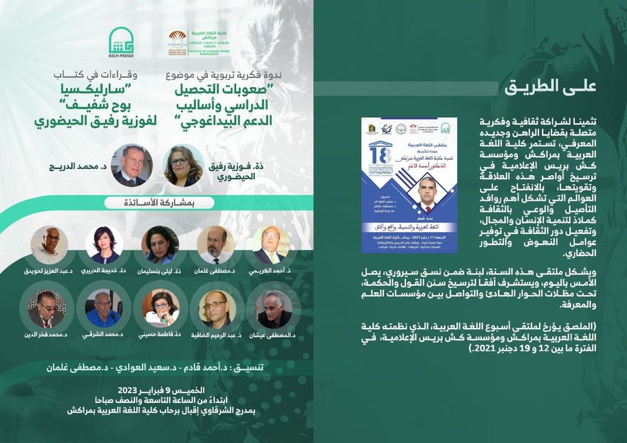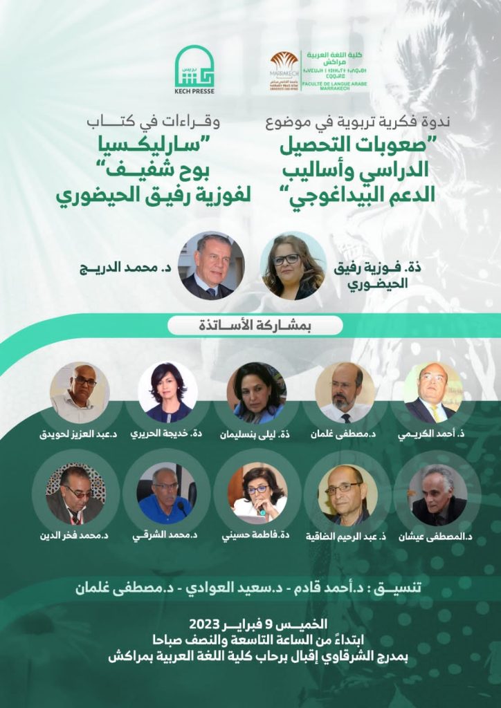 في إطار الشراكة التي تجمع بين مؤسسة “كش بريس” الإعلامية وكلية اللغة العربية بمراكش، ستنظم ندوة فكرية تربوية في (صعوبات التحصيل الدراسي وأساليب الدعم البيداغوجي)، بالإضافة إلى حفل توقيع وقراءة المنجز التربوي الجديد للكاتبة والشاعرة الأستاذة فوزية رفيق الحيضوري (سارليكسيا ..بوح شفيف ).