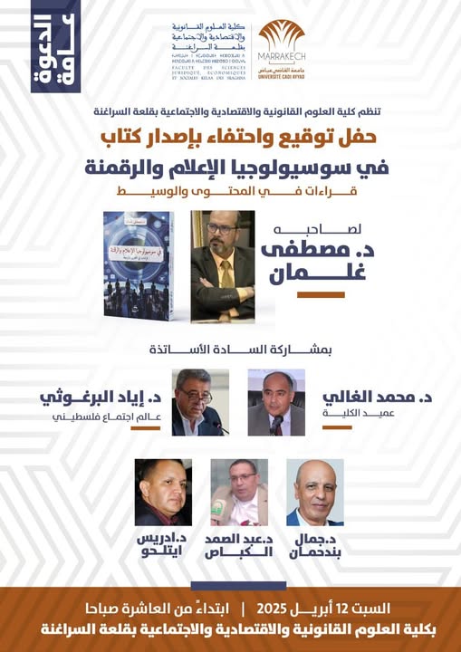 تنظم كلية العلوم القانونية والاقتصادية والاجتماعية بمدبنة قلعة السراغنة، ندوة احتفائية بالإصدار الجديد للإعلامي والباحث الدكتور مصطفى غلمان، الموسوم ب”في سوسيولوجيا الإعلام والرقمنة: قراءات في المحتوى والوسيط”. وذلك بمشاركة كل من عميد كلية الحقوق وأستاذ العلوم السياسية الدكتور محمد الغالي، ومقدم الكتاب عالم الاجتماع الفلسطيني المفكر الدكتور إياد البرغوثي، والباحثين الأكاديميين: الدكتور جمال بندحمان والدكتور عبد الصمد الكباص والدكتور ادريس ايتلحو. وتقام الندوة بالقاعة الكبرى للندوات بذات الكلية، يوم السبت 12 أبريل 2025 ابتداء من الساعة العاشرة 10.00 صباحا.