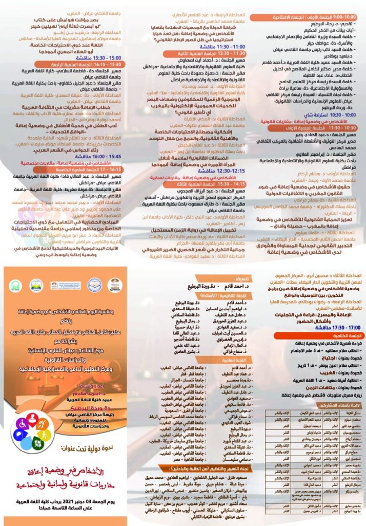 اتفق المشاركون في افتتاح أشغال الندوة الدولية، التي التأمت صباح يومه الجمعة 03 دجنبر الجاري، برحاب كلية اللغة العربية، تحت عنوان “الأشخاص في وضعية إعاقة : مقاربات قانونية ولسانية واجتماعية”، على استثارة الأهداف الكبرى، الكامنة وراء تنظيم الملتقى، الذي جاء في إطار اليوم العالمي للأشخاص في وضعية إعاقة، ومن بين تلكم الأهداف تعزيز الجهود الجماعية الرامية إلى تعميم الاستفادة من الخدمات الأساسية، ومن ضمنها الحماية الصحية والاجتماعية والتعليم والبنيات الأساسية الرقمية، والمعلومات سهلة المنال والتوظيف وغيره من الفرص الاجتماعية والثقافية، بغية ضمان عدم ترك الأشخاص في وضعية إعاقة خلف الركب في أوقات الأزمات وما بعدها.