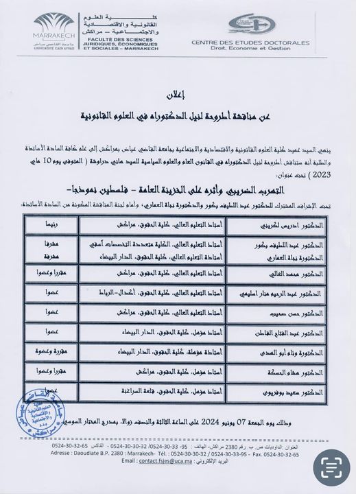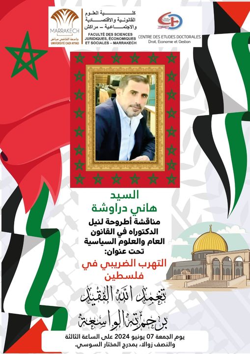 هذا وستتم مناقشة الأطروحة في القانون العام والعلوم السياسية للباحث الفلسطيني الفقيد هاني دراوشة في موضوع “التهرب الضريبي وأثره على الخزينة العامة ـ فلسطين نموذجا ـ” تحت إشراف كل من الدكتور عبد اللطيف بكور والدكتورة نجاة العماري، يوم الجمعة 7 يونيو 2024 في الساعة الثالثة والنصف بمدرج المختار السوسي بكلية الحقوق مراكش.