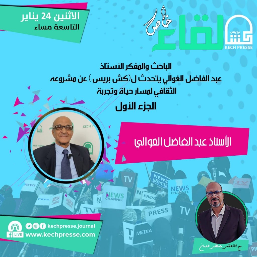 المفكر الأستاذ عبد الفاضل الغوالي، يتحدث في برنامج “لقاء خاص” على KECHPRESSE.COM ( يقع في جزإين) عن انطلاقاته الأولى بالاهتمام بالشأن الثقافي، وعن مأسسة هذا الجانب في مسيرته، ومفعول ذلك على أرضية الواقع، وتأثيرات ذلك على مساره المهني بصفته مدرسا للغة الفرنسية، والحضارة الفرنسية المرتبطة به.ويجوب بنا الأستاذ الغوالي عوالم رحلته المهنية سبعينيات القرن الماضي، أيام تدريسه للغة الفرنسية واللسانيات، وتأطيره التربوي مفتشا مركزيا للغة الفرنسية منذ 1985، ثم مديرا للمركز CPR السويسي بالرباط 1995، حيث يجيب عن أسئلة التأطير التربوي وفق مشاريع المؤسسة المطروح على أنظار الوزارة وتحت إشراف وزير التربية الوطنية شخصيا، ثم أي مسار لهذه التجربة وأية استراتيجية؟ولم يفت المفكر الغوالي أن يفكك إشكالية العلاقة بين المجتمع والمثقف ، ودور هذا الأخير، في ضوء المتغيرات العصرية ، دون أن يحيد عن أنموذجية الثورة الفكرية الفرنسية، عبر تقاطعاتها الزمنية والابستمولوجية .موعدكم مع هذه المقابلة الفكرية الإعلامية الهامة قريبا .