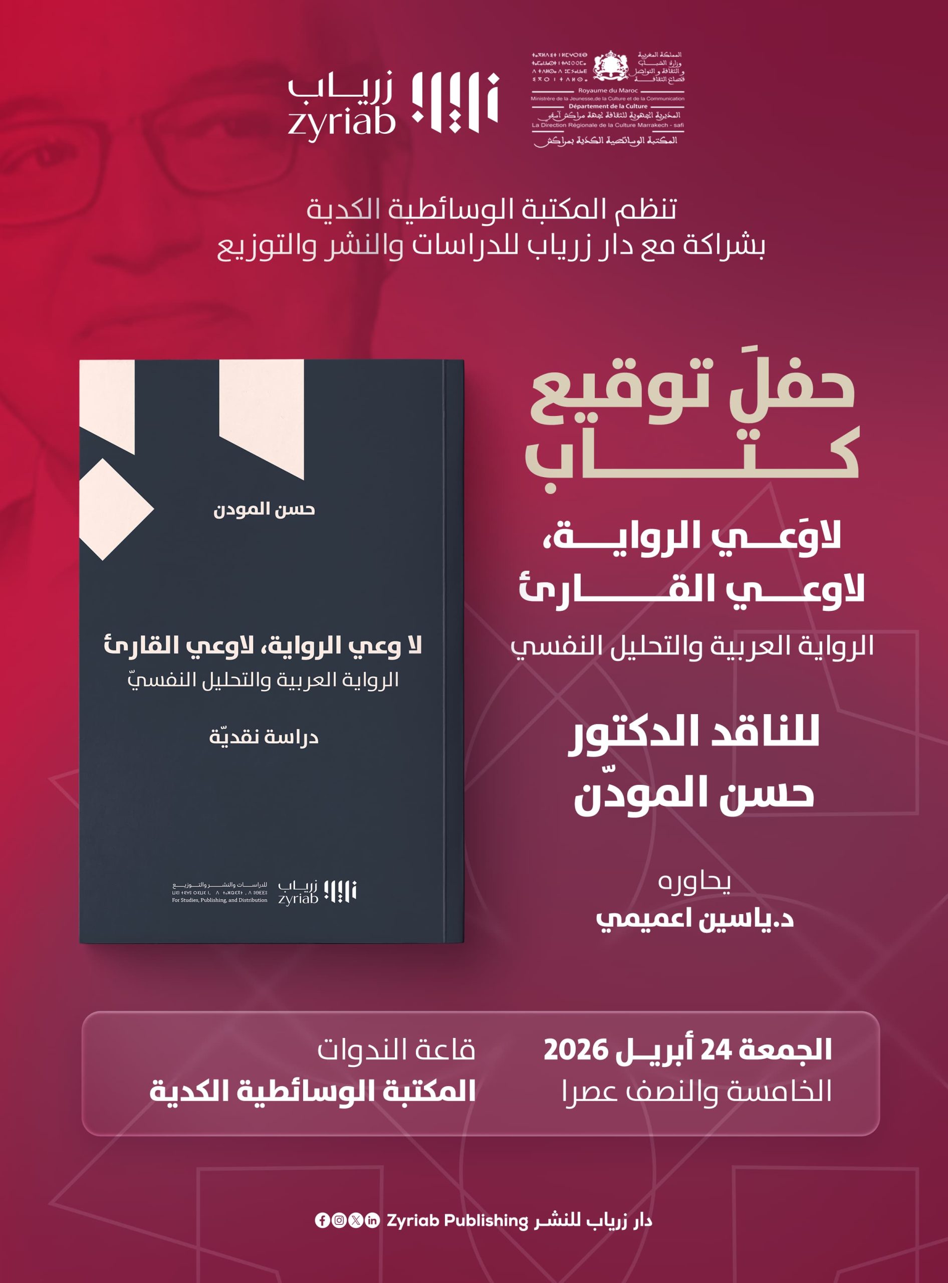 ويحل الأكاديمي حسن المودن ضيفاً على هذا الموعد الثقافي لتقديم عمله الجديد الموسوم بـ لا وعي الرواية، لا وعي القارئ: الرواية العربية والتحليل النفسي، وذلك بشراكة مع دار زراب للدراسات والنشر والتوزيع، يوم الجمعة 24 أبريل 2026، ابتداءً من الساعة الخامسة والنصف مساءً، بقاعة الندوات التابعة للمكتبة.