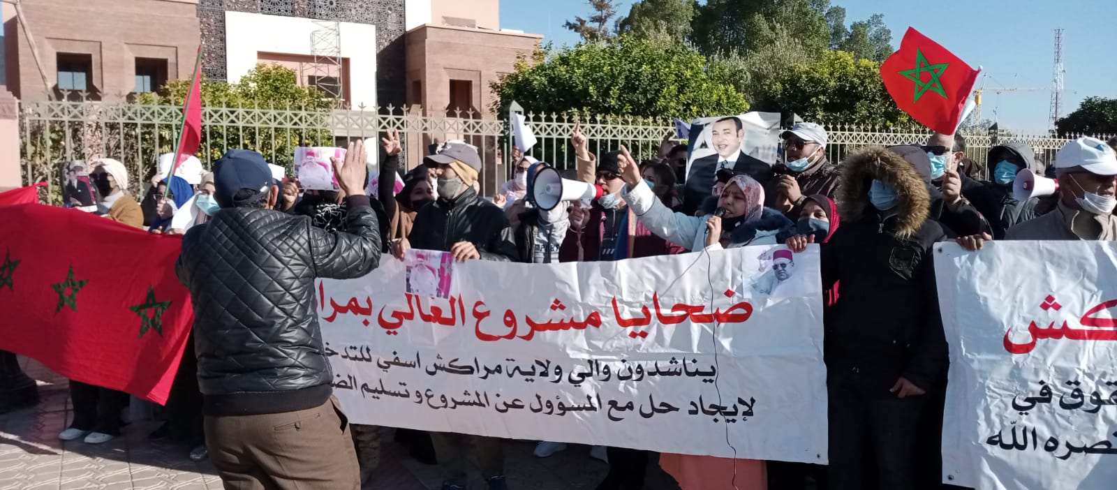 نفذ متضررون من مشاريع سكنية بمراكش وقلعة السراغنة والصويرة، صبيحة يومه الخميس 09 دجنبر الجاري، وقفة احتجاجية أمام مقر ولاية جهة مراكش أسفي، حاملين لافتات تدين شركات عقارية وصور ملك البلاد، رافعين أصواتهم ضد مافيا عقارية.