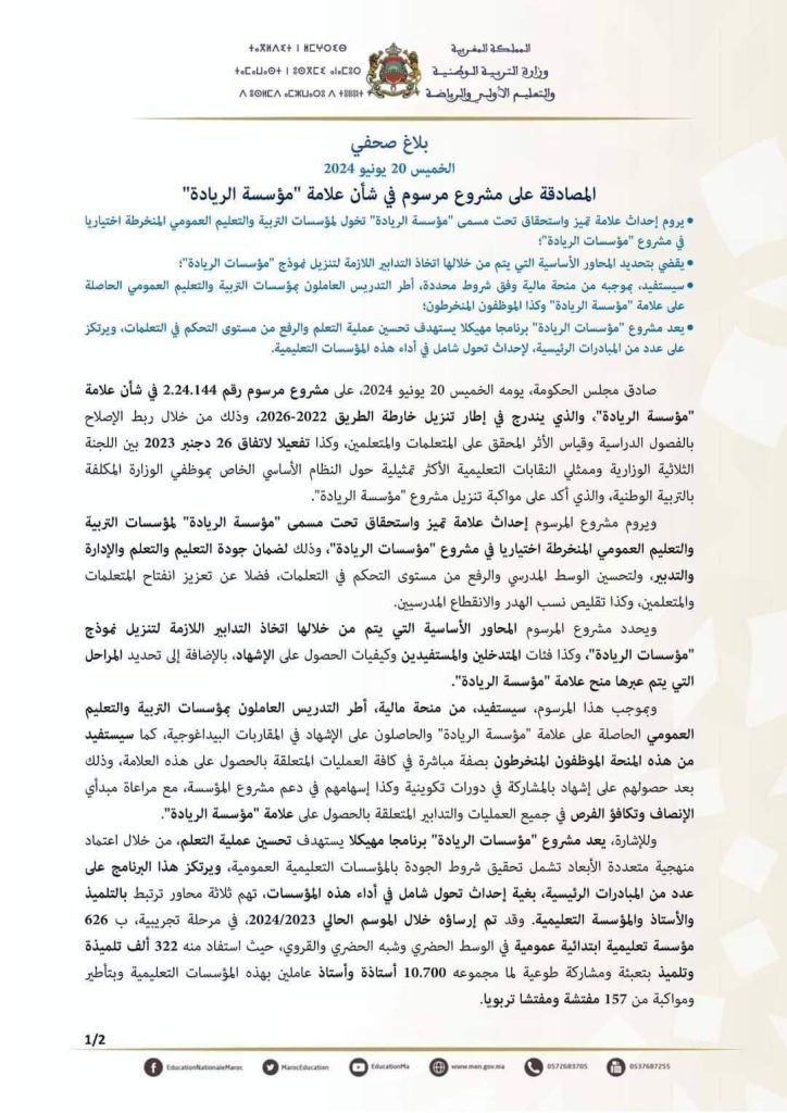 وأضاف المصدر نفسه، أن مشروع هذا المرسوم، يهدف إلى إحداث علامة تحت مسمى “مؤسسات الريادة” كمشروع تربوي تنخرط فيه مؤسسات التربية والتعليم العمومي، لضمان جودة التعليم والتعلم، ولتحقيق حكامة إدارة وتدبير هذه المؤسسات، بهدف الرفع من مستوى التحكم في التعلمات الأساس وتعزيز انفتاح المتعلمات والمتعلمين وكذا للتقليص من نسب الهدر والانقطاع المدرسيين.