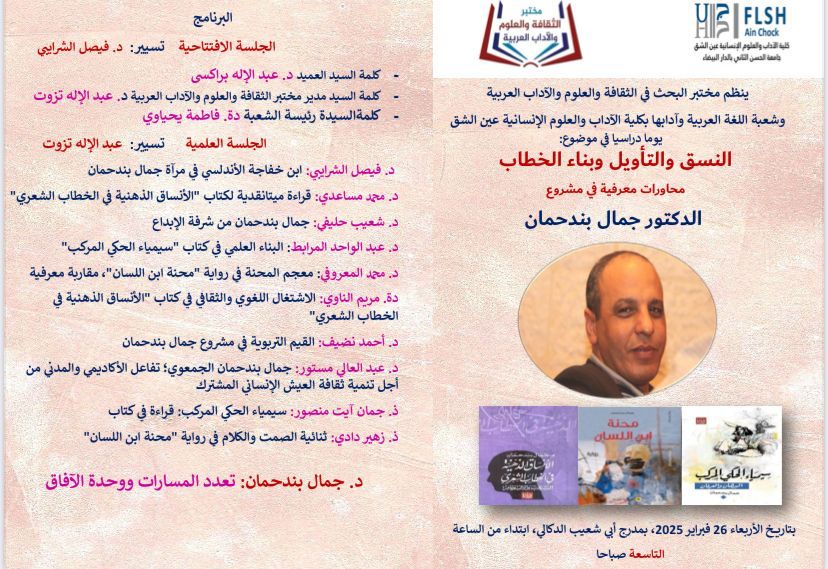 ينظم مختبر البحث في الثقافة والعلوم والآداب العربية، بكلية الآداب عين الشق،وشعبة اللغة العربية بها يوم الأربعاء 26 فبراير 2025 ابتداء من الساعة التاسعة صباحا، بمدرج أبي شعيب الدكالي يوما دراسيا حول المشروع النقدي والإبداعي في مسار الناقد والباحث والمبدع جمال بندحمان. وقد اختار المنظمون موضوعا له: النسق والتأويل وبناء الخطاب: محاورات معرفية.