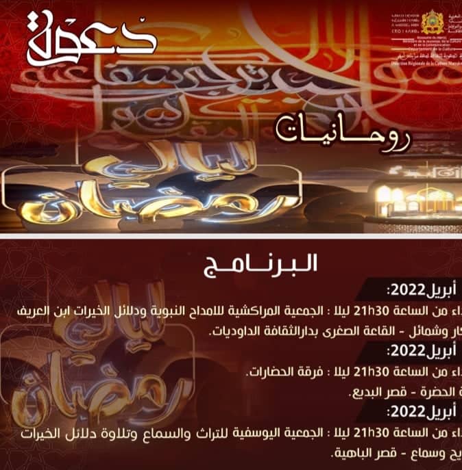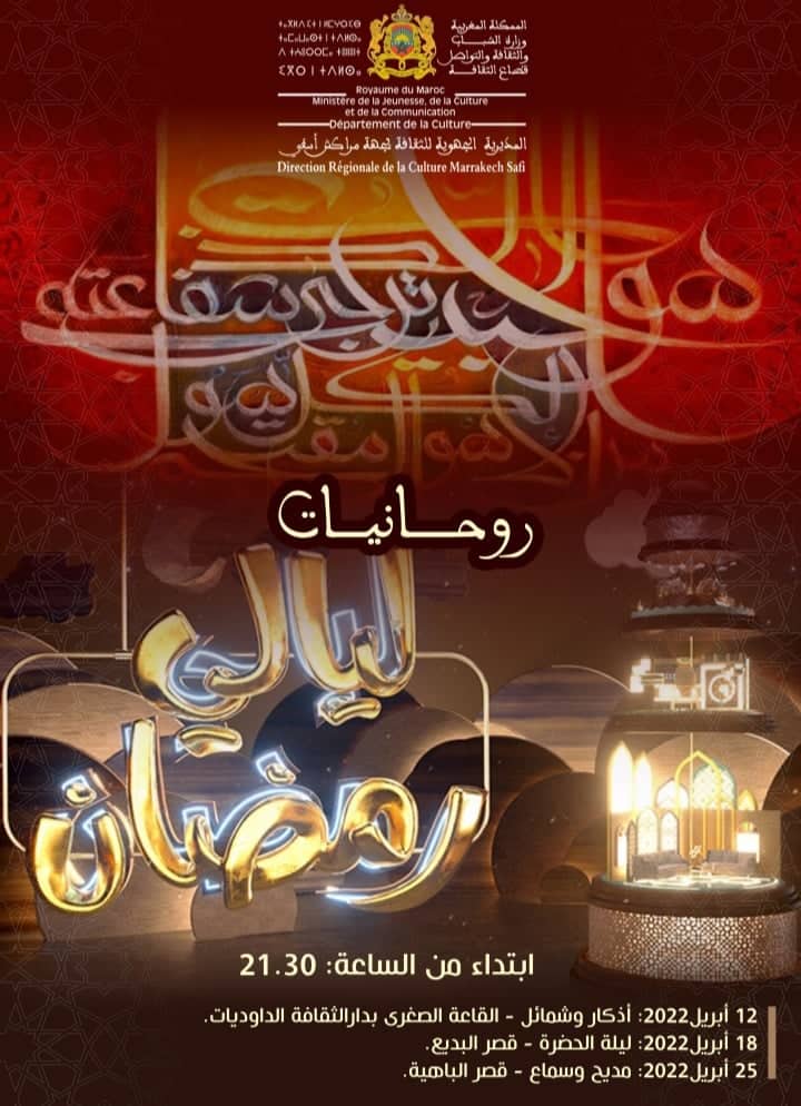 تقيم المديرية الجهوية للثقافة مراكش أسفي، في الفترة الممتدة ما بين 12 و25 أبريل 2022 م الموافق من 10 و23 رمضان 1443ه، فعاليات “روحانيات ليالي رمضان”، والتي تتضمن مجموعة من الحفلات الفنية ذات طابع روحاني .
