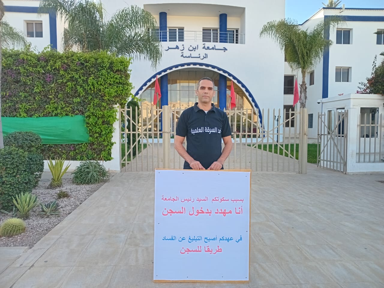 نفذ هشام مفتاح أستاذ التعليم العالي بالمدرسة الوطنية للعلوم التطبيقية بأكادير ، اليوم الثلاثاء، اعتصاما أمام رئاسة جامعة ابن زهر، احتجاجا على ما وصفه المعني ب “سكوت رئاسة الجامعة في ما أتعرض له من ظلم وتعسف وتزوير بسبب تبليغه عن الفساد بالمؤسسة”، وفق ما جاء في إشعار توصلت (كش بريس) بنسخة منه.
