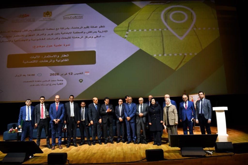 كش بريس/محسن منير ـ في إطار تعزيز النقاش العمومي حول قضايا التنمية والاستثمار، احتضن مدرج ابن رشد بـ جامعة محمد السادس متعددة التخصصات التقنية بابن جرير، يوم الخميس 12 فبراير 2026، ندوة علمية وازنة حول موضوع «العقار والاستثمار: الآليات القانونية والرهانات الاقتصادية»، بادرت إلى تنظيمها عمالة إقليم الرحامنة، بشراكة مع محكمة الاستئناف بمراكش، و**محكمة الاستئناف الإدارية بمراكش، والمحكمة الابتدائية بابن جرير، والمركز الجهوي للاستثمار لجهة مراكش–آسفي**، إلى جانب مركز الرحامنة للأبحاث والدراسات القانونية والاجتماعية والإنسانية. وقد عرفت الندوة مشاركة تفوق 200 من المسؤولين القضائيين والإداريين، والمنتخبين، والأساتذة الجامعيين، والخبراء، والفاعلين الاقتصاديين والمستثمرين.
