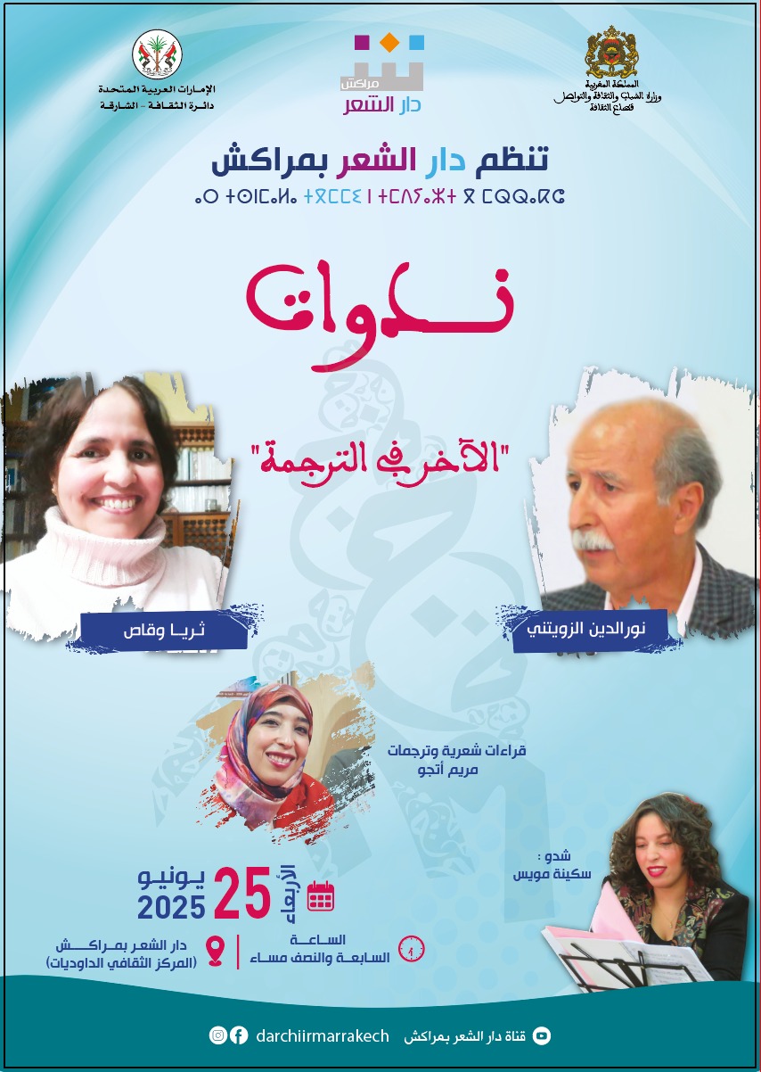 ويعرف اللقاء تقديم قراءات شعرية، الى جانب تقديم نصوص مترجمة من اللغة العربية الى الانجليزية، في حوارية للنصوص وإعطاء زخم تطبيقي لمستويات النقاش المعرفي. ويقدم الناقد والمترجم الشاعر نورالدين الزويتني رؤاه حول حضور “الآخر” في الترجمة، من خلال تجربته الرائدة ومساره الطويل في حقل الترجمة والإبداع والتفكير، فيما تستقصي الباحثة والشاعرة ثريا وقاص تجربتها في الترجمة من خلال سفر النصوص بين اللغات. كما تشارك الشاعرة مريم أتجو، إحدى إشراقات دار الشعر بمراكش والحاصلة على إجازة في علم الاجتماع، من خلال تقديم نصوص شعرية ترجمتها الى اللغة الانجليزية ومرافقتها لقراءات الشعراء (خديجة السعدي واسماعيل آيت ايدار)، في انتقال واعي من الدار الى مستويات تلمس هذه الإبدالات على مستوى الإبداع النصي.